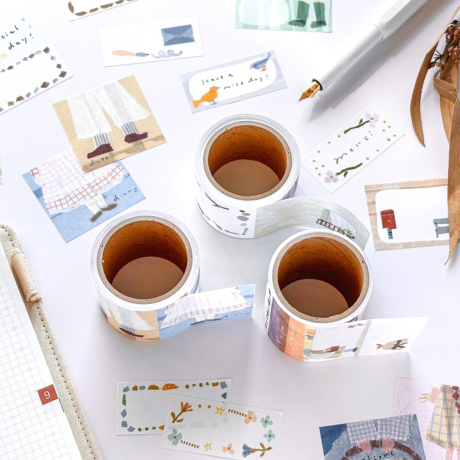 Known for her unique technique of layering tiny torn pieces of washi tape to express light and shadow, Miki created these designs to highlight the beauty that emerges when tapes are torn into small pieces and layered.