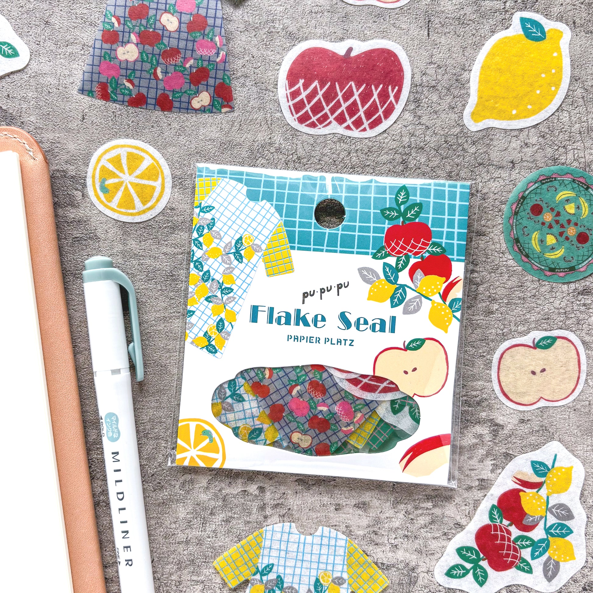A pack of cute fruits theme flake stickers designed by Japanese textile artist PUPUPU for your planner and journal decoration! 9 designs, 6 stickers each, 54 in total.
