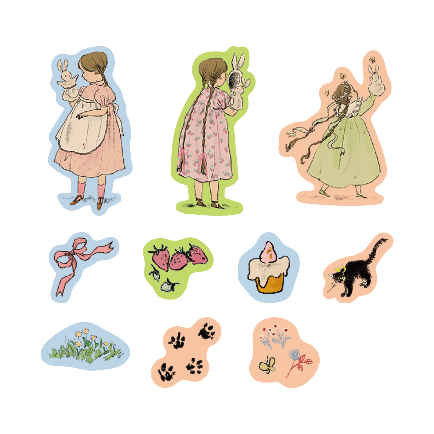 Cute flake stickers in an adorable paper box designed by Japanese artist Rei Kurahashi, known for her unique blend of retro and cozy illustrations featuring children and animals. Includes 40 flake stickers, 10 designs, 4 pieces per design.