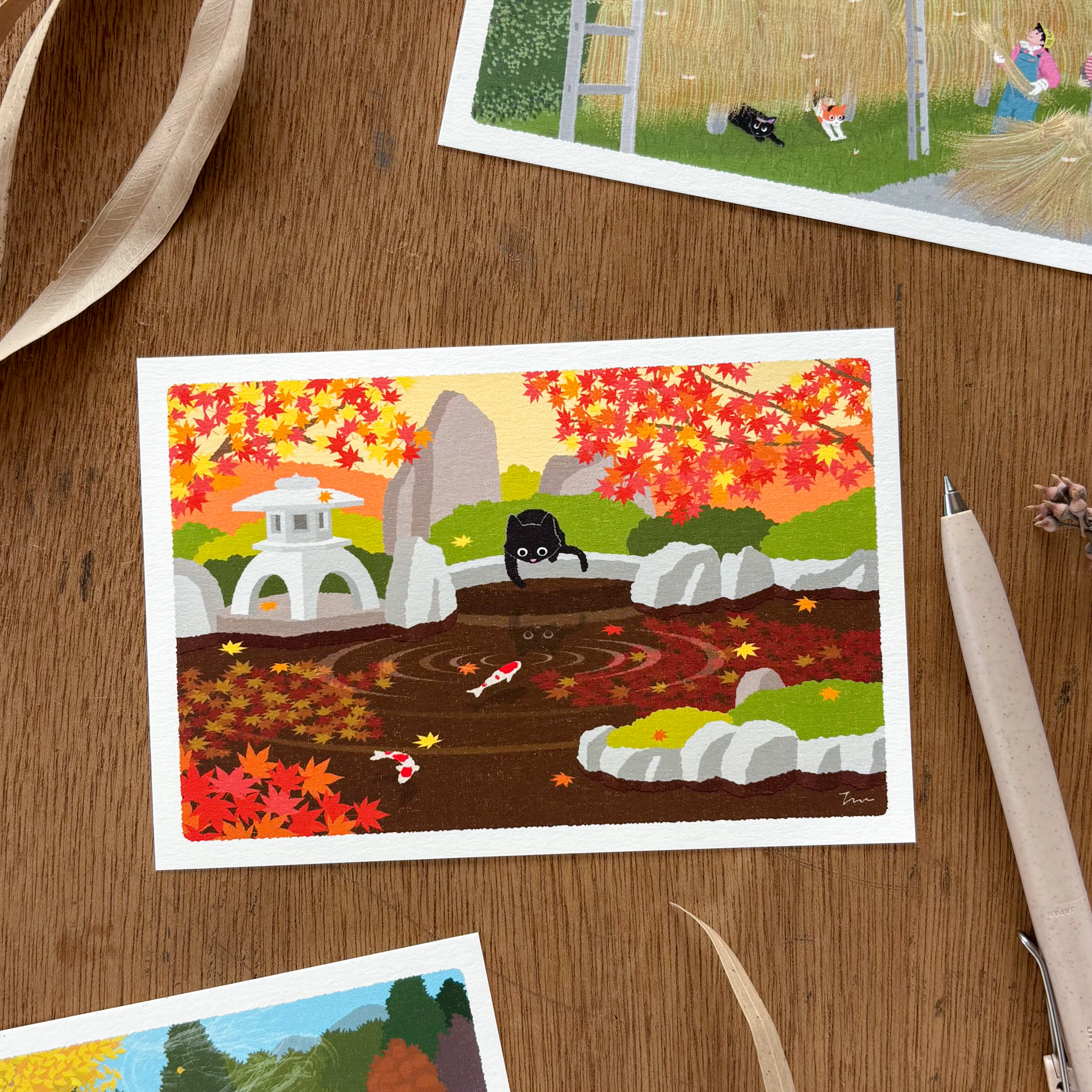 Welcome to the "tabi neko" postcard series by Toshinori Mori, a Japanese illustrator. These traveling cats take you on a journey through the seasons in Japan.