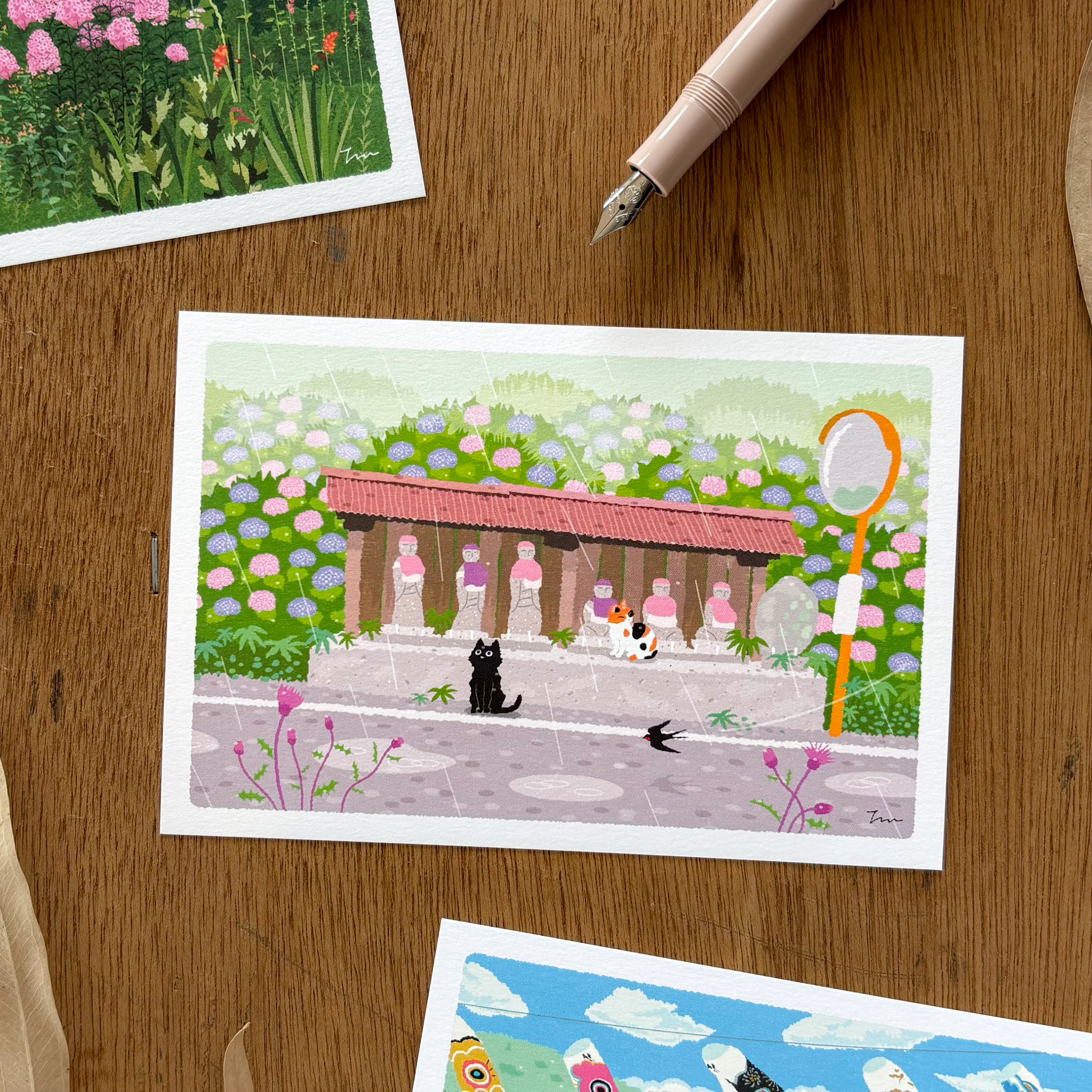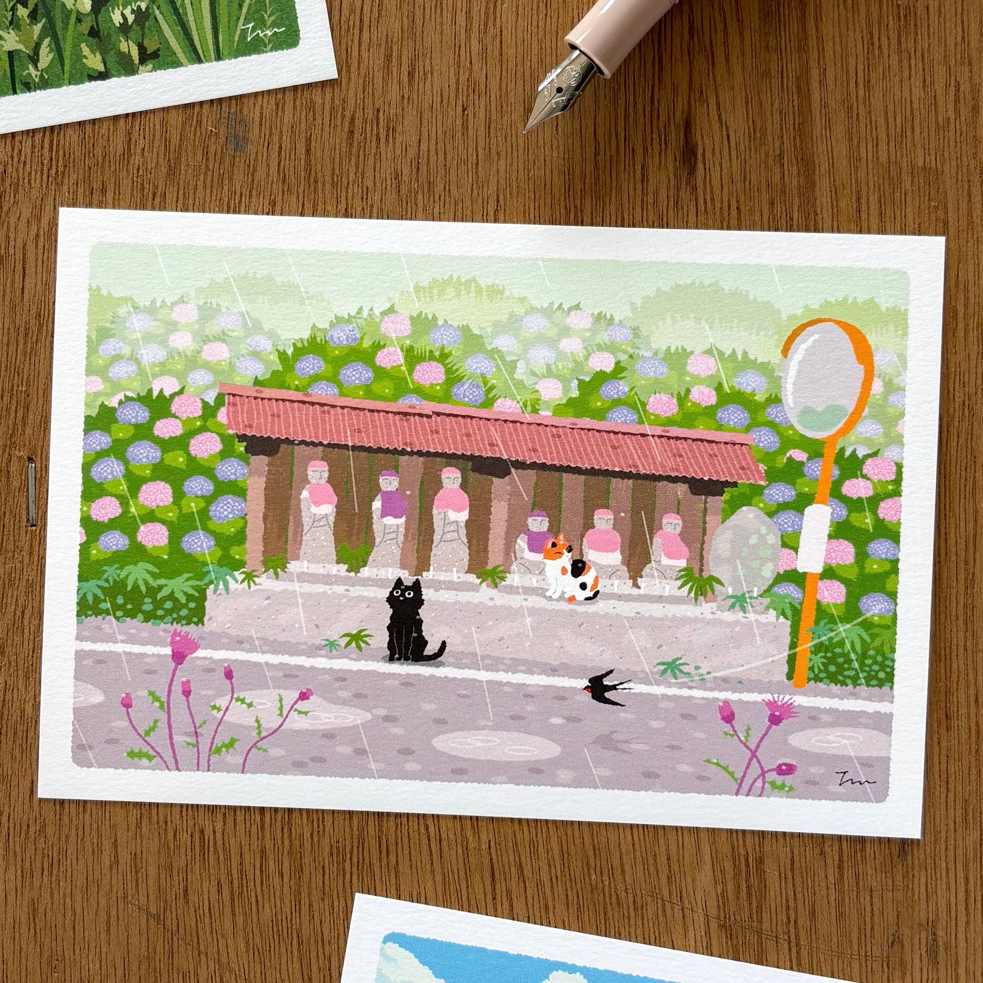 Welcome to the "tabi neko" postcard series by Toshinori Mori, a Japanese illustrator. These traveling cats take you on a journey through the seasons in Japan.