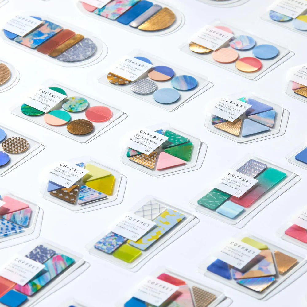 Inspired by make-up palettes, COFFRET is a new peel and stick PET stickers designed by a Japanese artist Smanim from stationery brand HITOTOKI. The nuanced colors and foil embossing parts of stickers make them look and feel like a make-up palette. The transparent film materials are perfect to apply in layers!