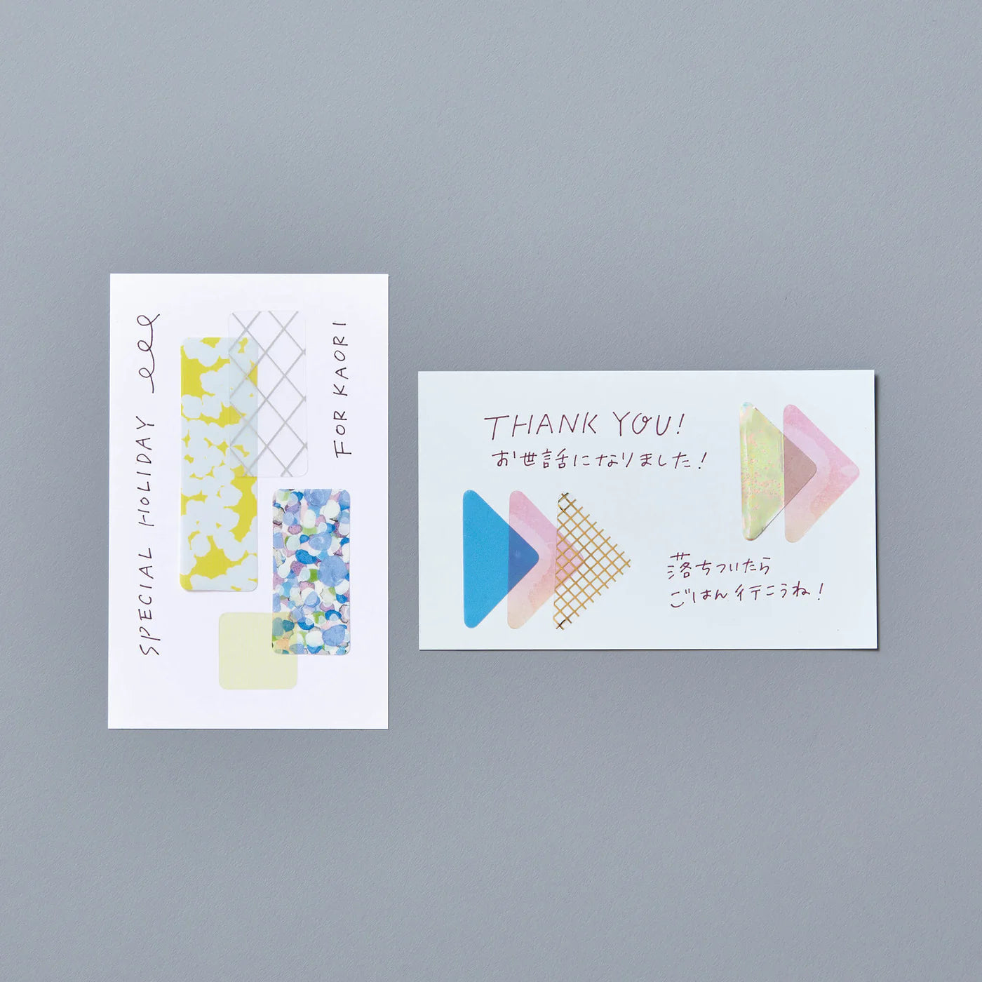 After picking up a sticker from a palette-like case, you can peel each sticker off the base paper from the other side (right end) of the sticker (see the 5th and 6th pictures of another palette). Stickers are clear film stickers that can be removed and repositioned like washi tape, and the set comes with 6 different designs (8 pieces per designs).