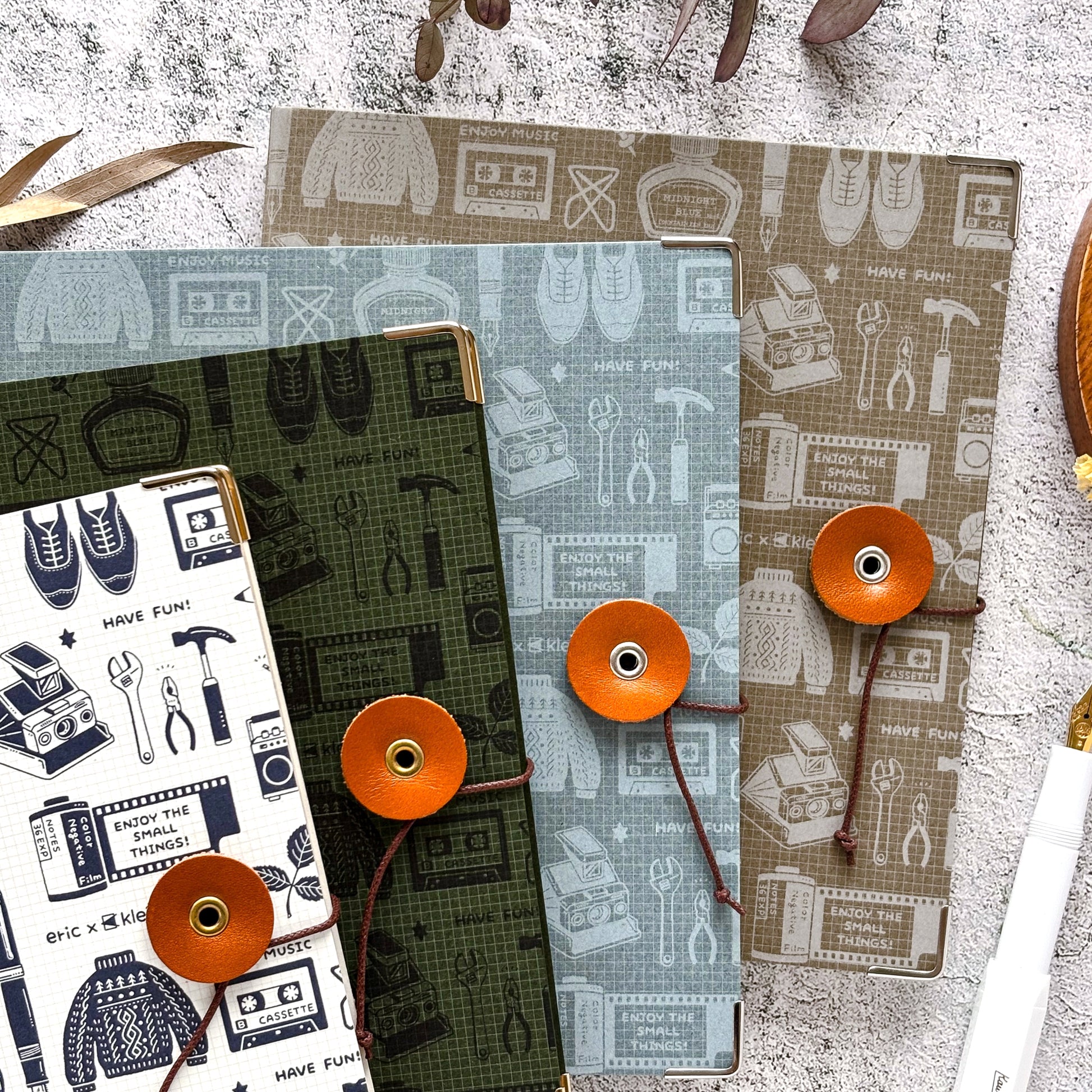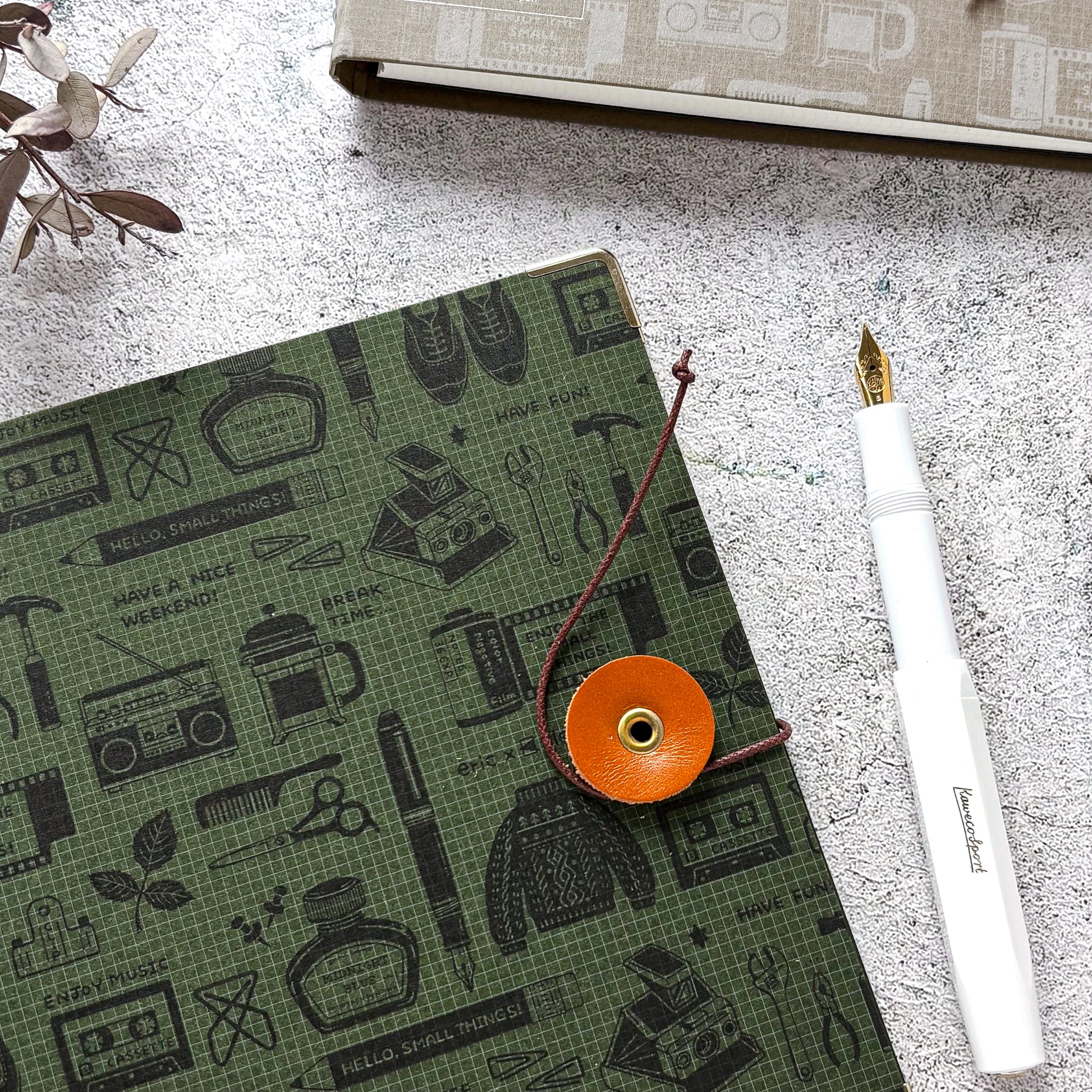 机の引き出しをひっくり返したような、小さなもので溢れた世界と、どこか懐かしさを感じさせる作風が人気の消しゴムはんこ作家ericさんのデザインが可愛いノート。使い込む程に味が出る表紙に、高品質な栃木レザーの丸留め。角の保護にもなるコーナー金具がアクセントに。2mm方眼ノートにもericさんのデザインが入り、巻末には両面ポケットも付属。