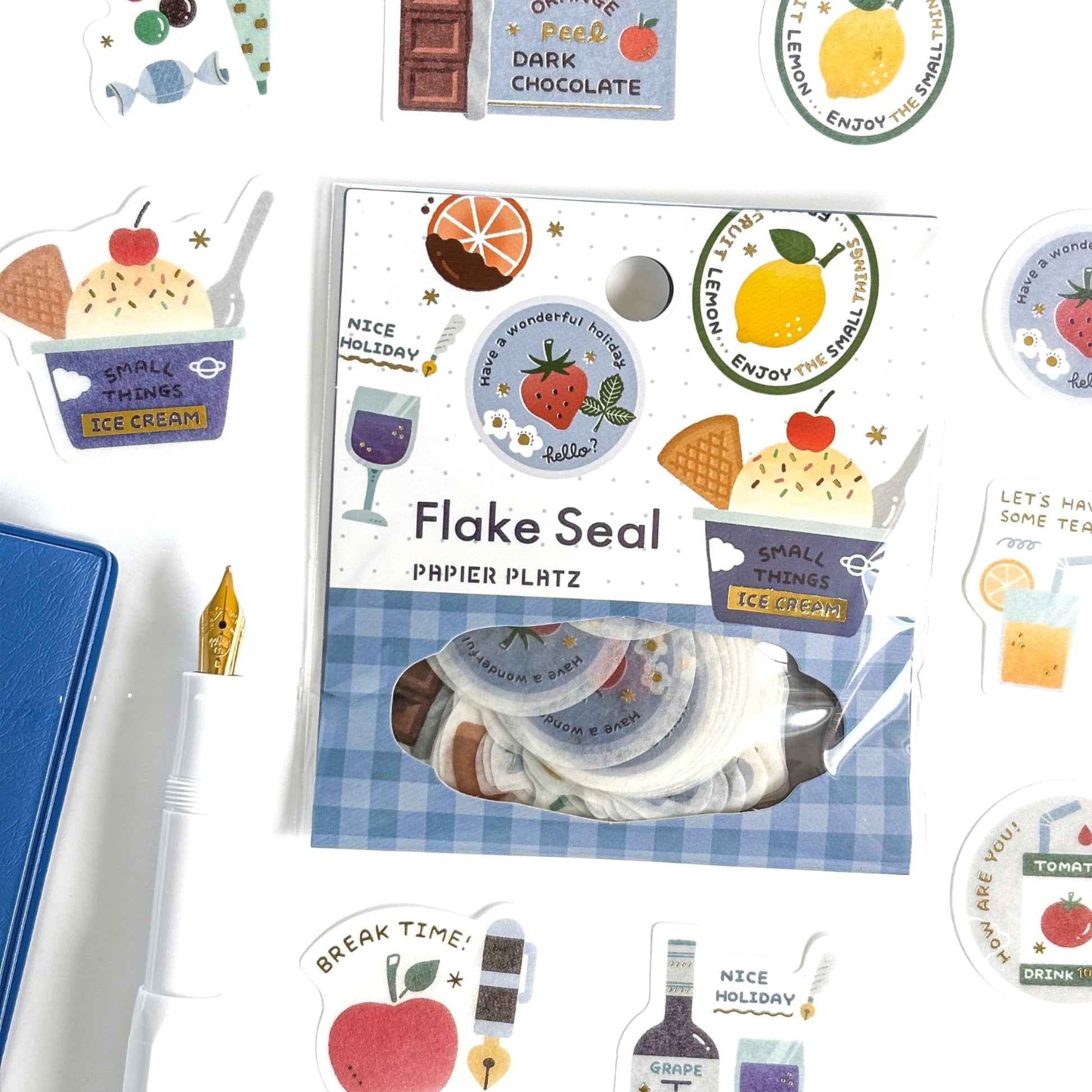 消しゴムはんこ作家ericさんデザインの可愛いフレークシール。大小様々なサイズのマステ素材の箔入りフレークシールが9種×各6枚(計54枚)入っています。