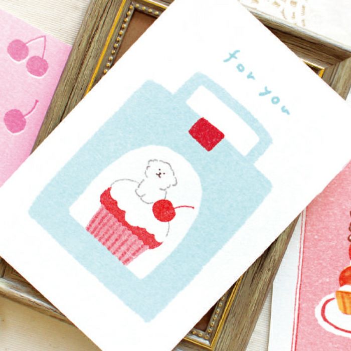 Cute postcard from "Okashina Animal Studio" collection. It is printed using a unique risograph technique, where each color is applied separately, creating delightful, one-of-a-kind misprints - often called 'fun taste' in Japanese.