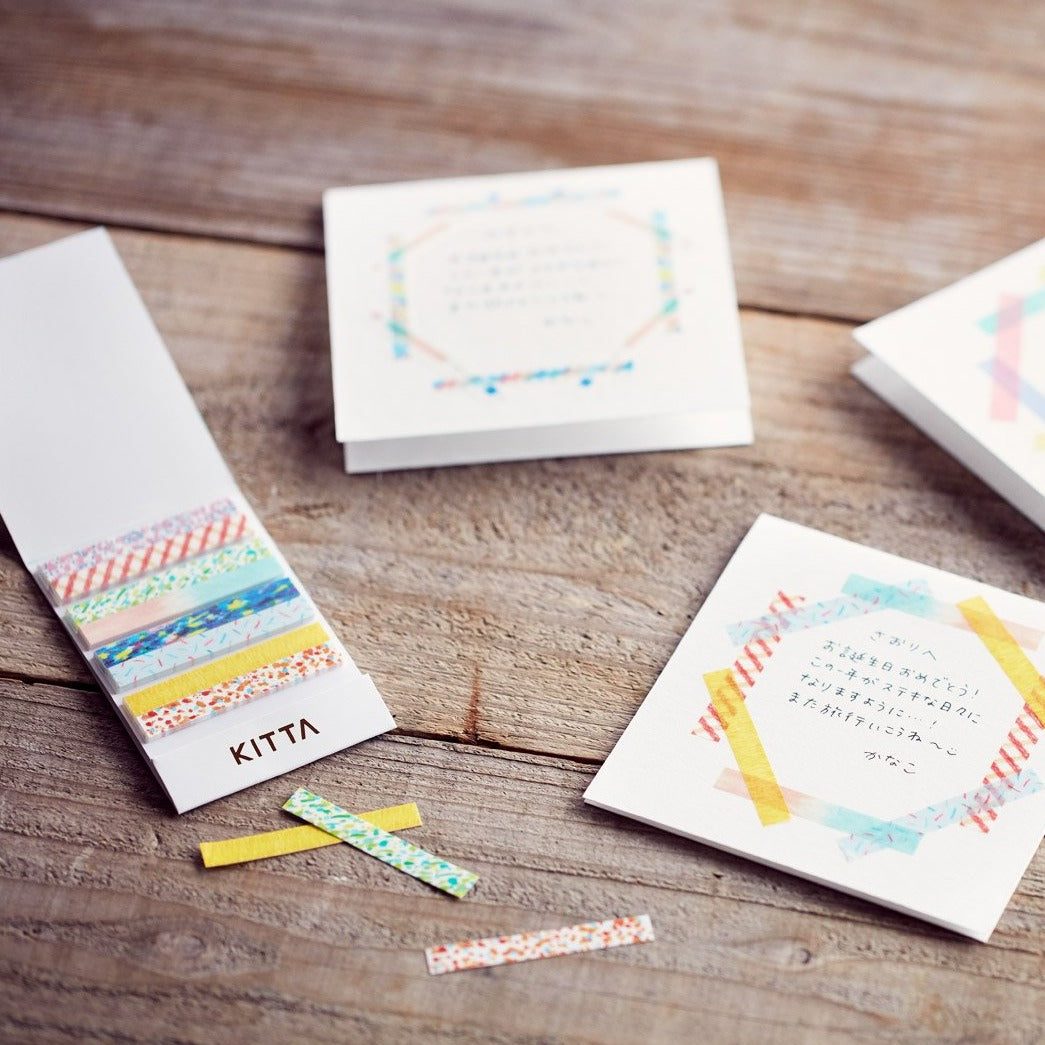 KITTA is a handy portable planner stickers set in a cute package. The beautiful watercolor design is by a Japanese illustrator Keina Higashide. Each sticker is pre-cut to 5cm long of 8 different slim designs (10 pieces per design). You can tuck the cover in the bottom (the white area that says KITTA) to keep it closed.