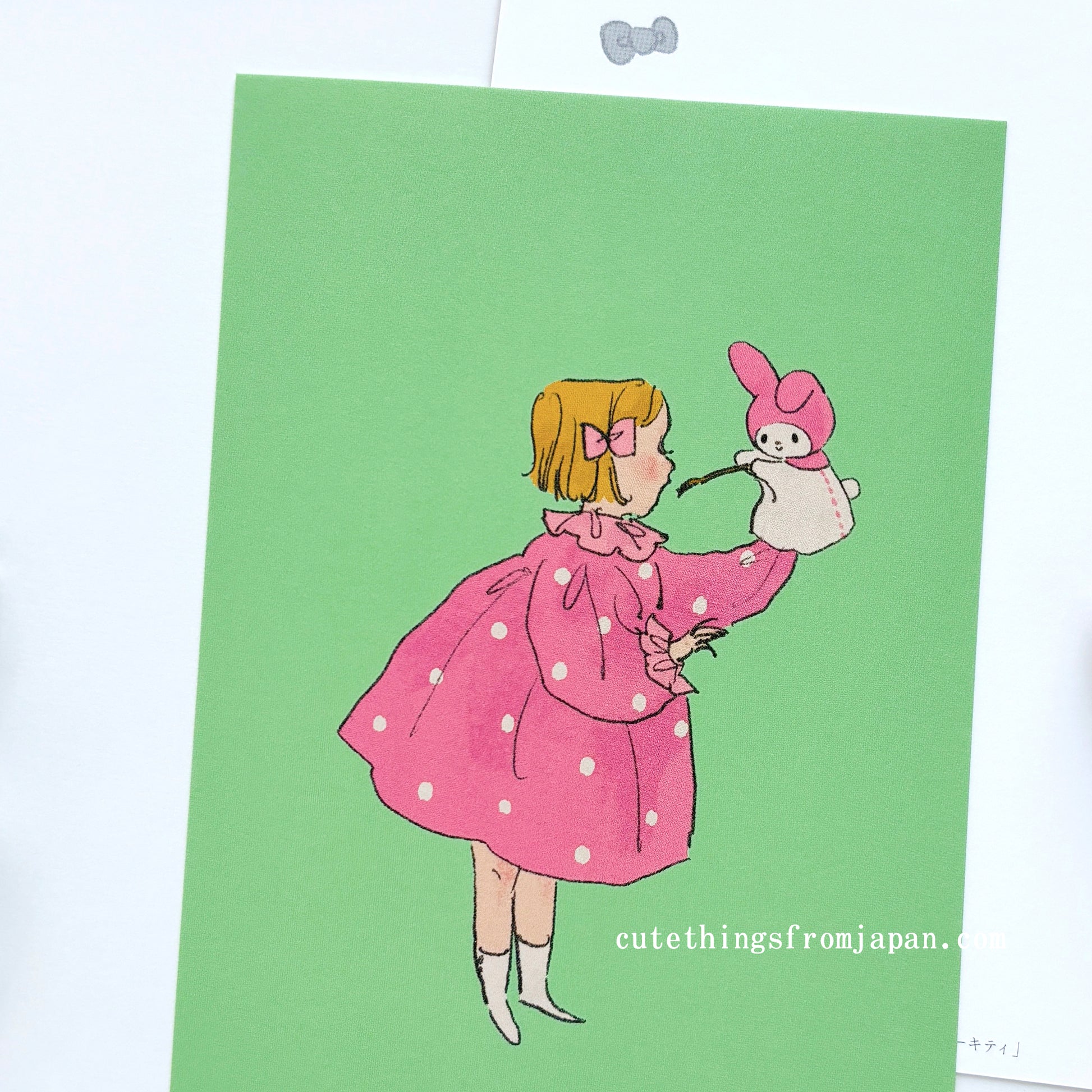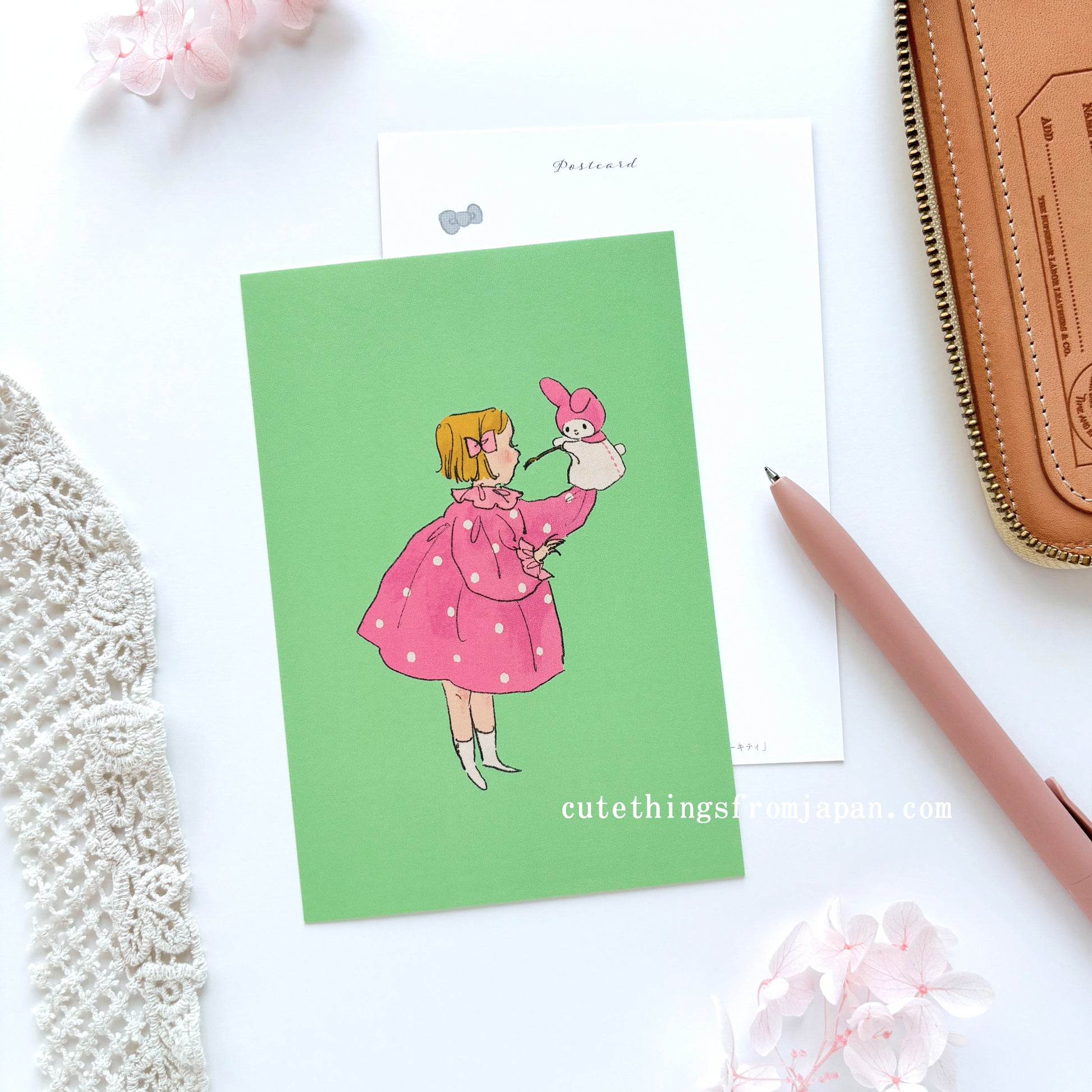 This is a limited edtion beautiful postcard by a Japanese illustrator Rei Kurahashi in collaboration with Sanrio! Rei Kurahashi is known for her beautiful retro cozy feeling illustrations of children and animals and draws for story books, magazines and books.