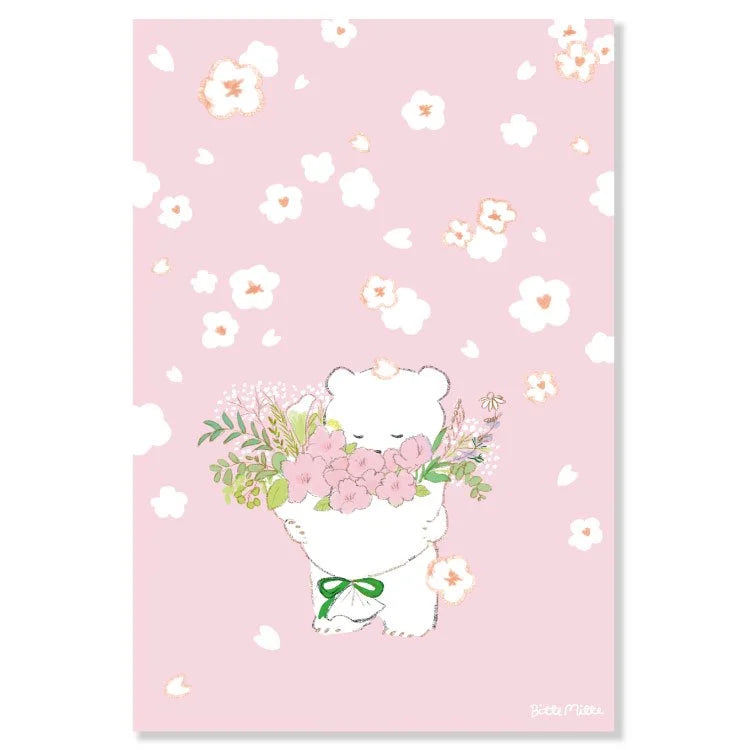 Cute postcard of a polar bear gifting beautiful cherry blossom bouquet designed by Japanese illustrator momoro.
