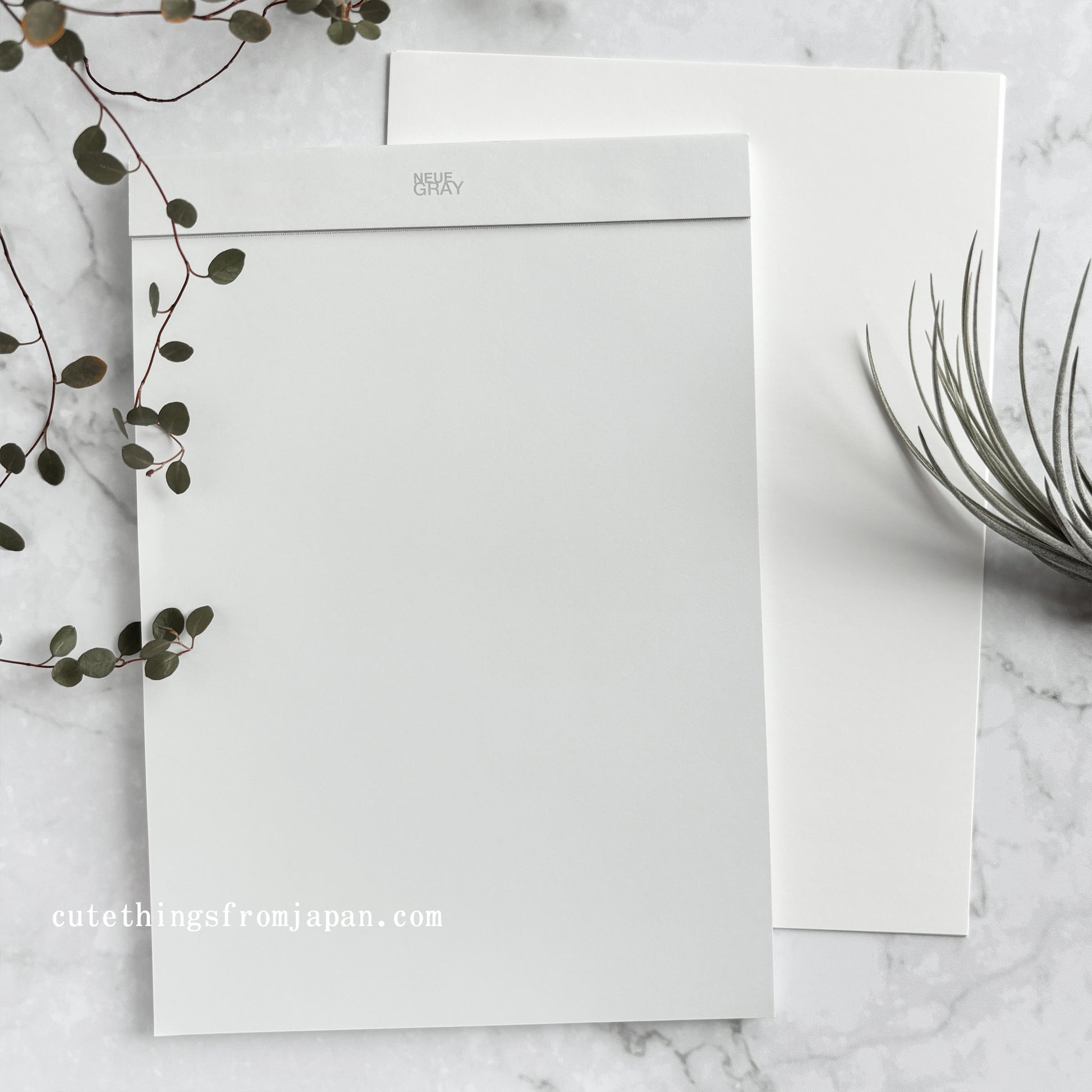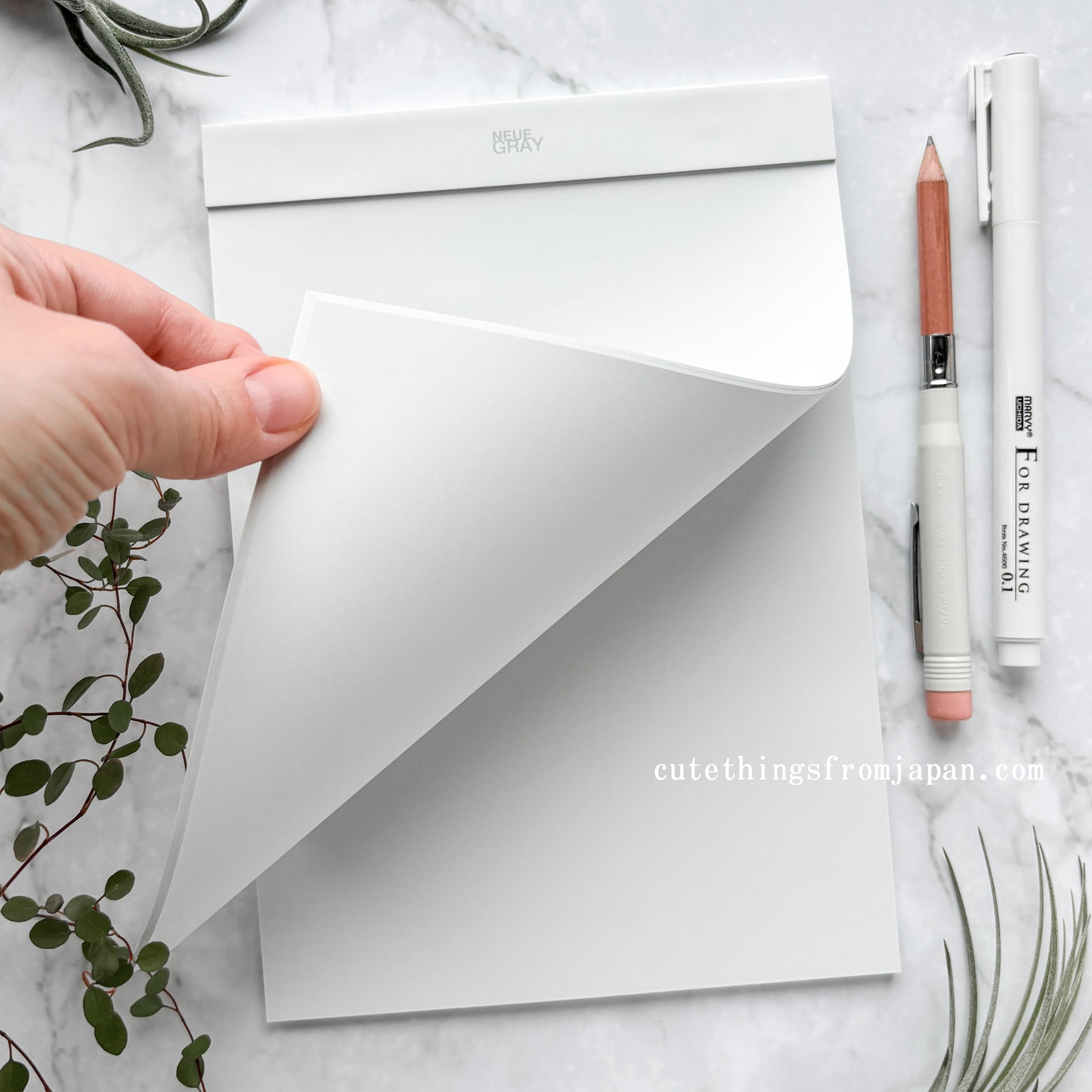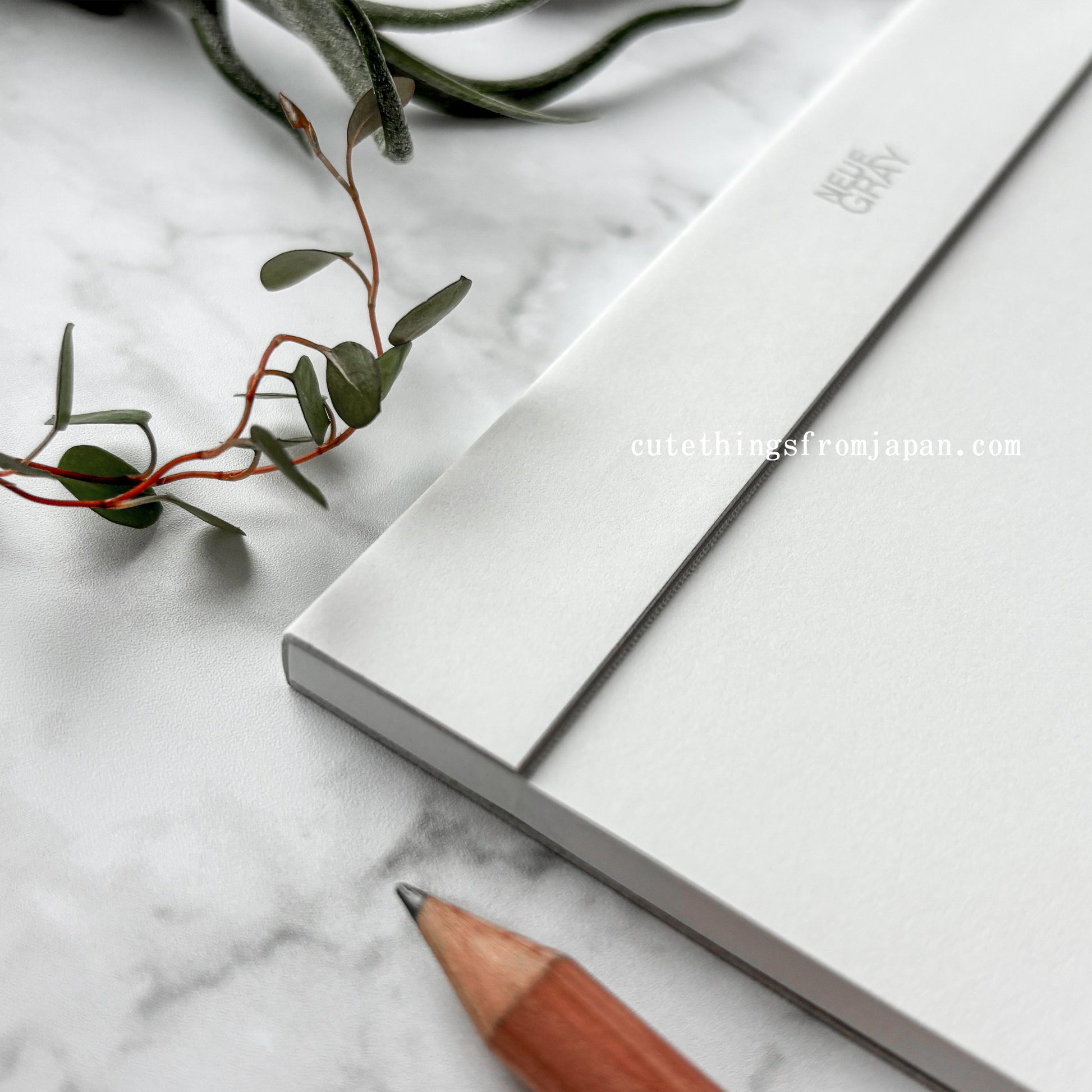 This note pad, Neue Gray, offers a refreshing writing experience with its unique design. The paper, provided by Yoshikawa Paper since 1909, addresses concerns raised by artists and delivers a writing surface that is both easy on the eyes and preserves the vibrancy of ink colors. Unlike bright white paper that can cause eye strain, or cream paper that can affect ink colors, this slightly gray-white paper minimizes fatigue while producing sharp lines and rich shading for pencils, ballpoint pens, and fountain pens. Additionally, ghosting and showthrough are significantly reduced.