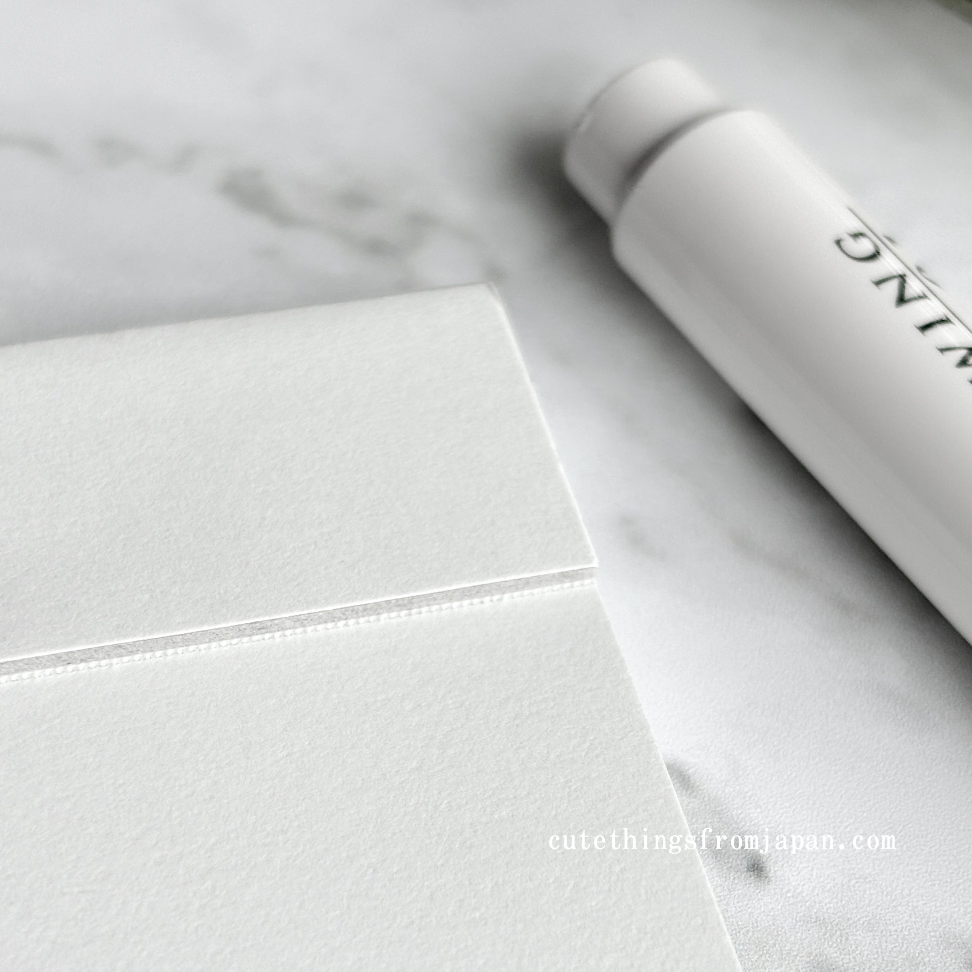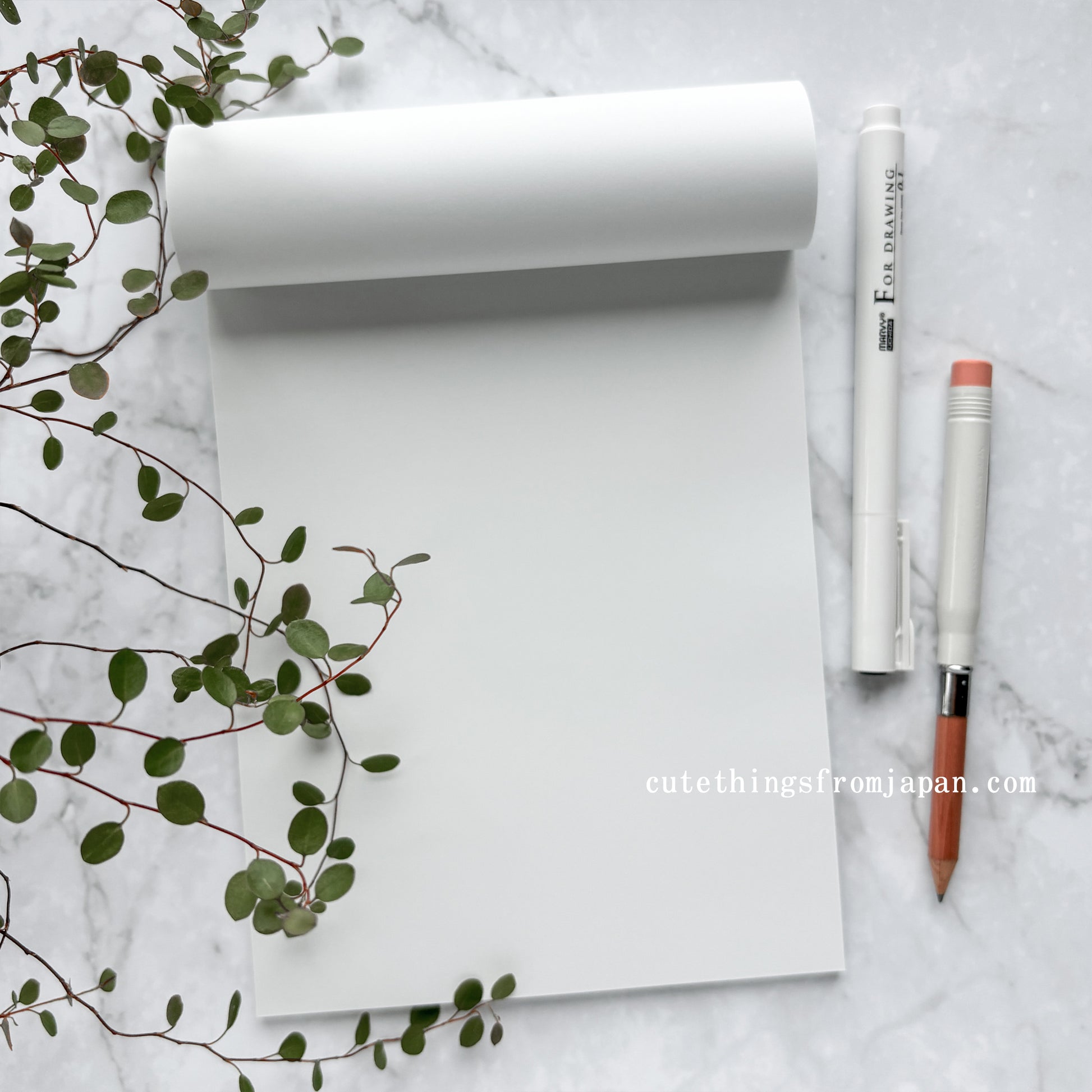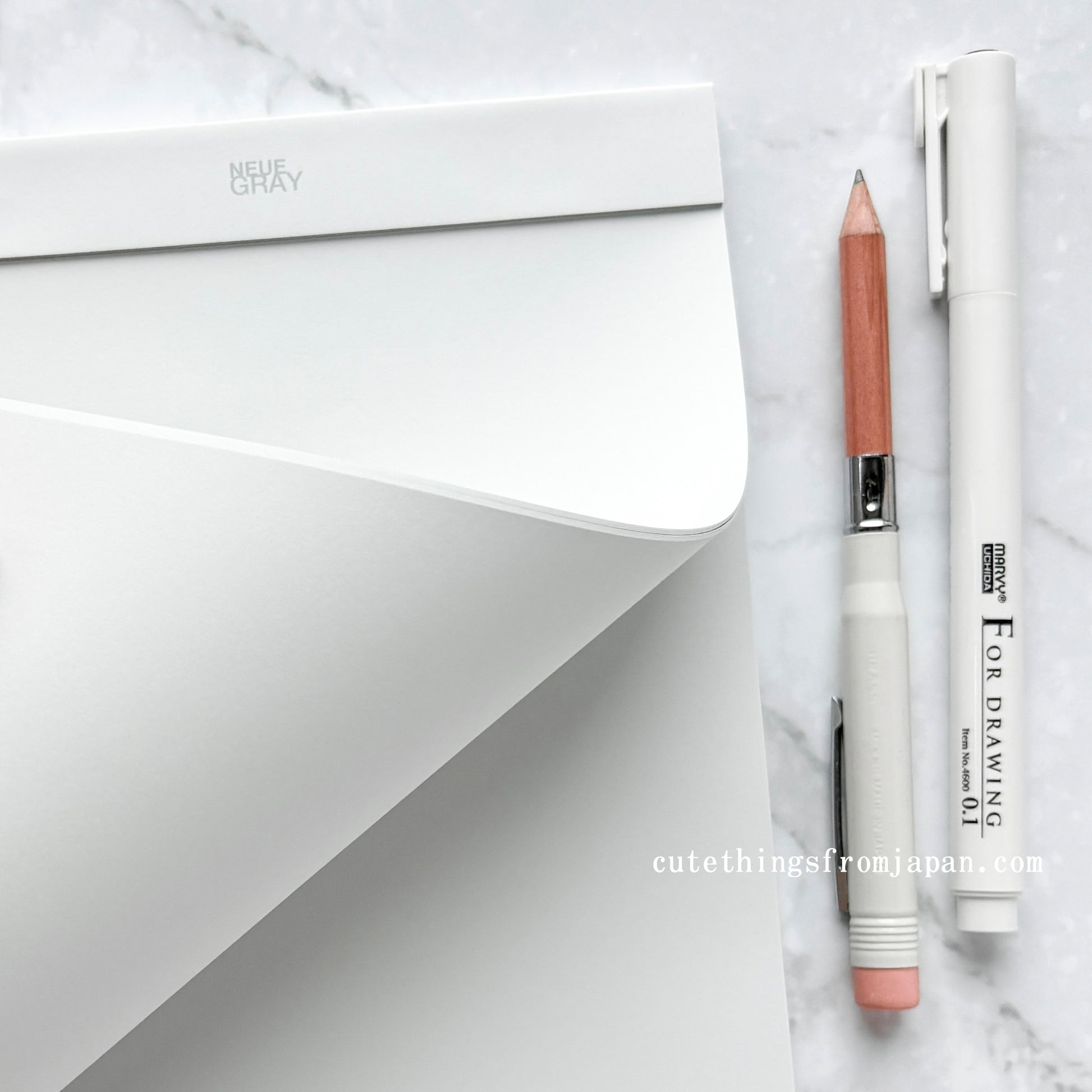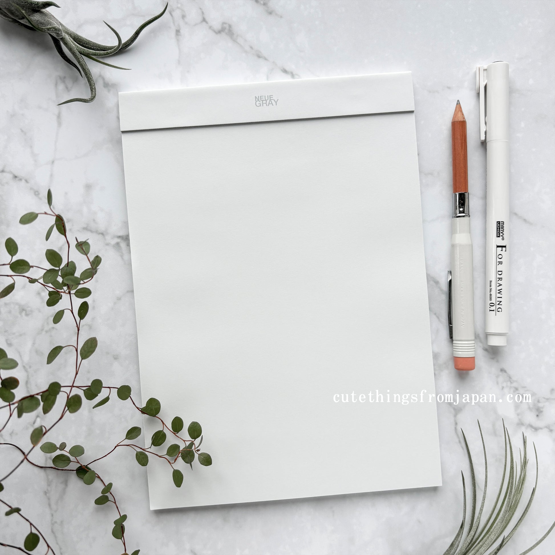 This note pad, Neue Gray, offers a refreshing writing experience with its unique design. The paper, provided by Yoshikawa Paper since 1909, addresses concerns raised by artists and delivers a writing surface that is both easy on the eyes and preserves the vibrancy of ink colors. Unlike bright white paper that can cause eye strain, or cream paper that can affect ink colors, this slightly gray-white paper minimizes fatigue while producing sharp lines and rich shading for pencils, ballpoint pens, and fountain pens. Additionally, ghosting and showthrough are significantly reduced.