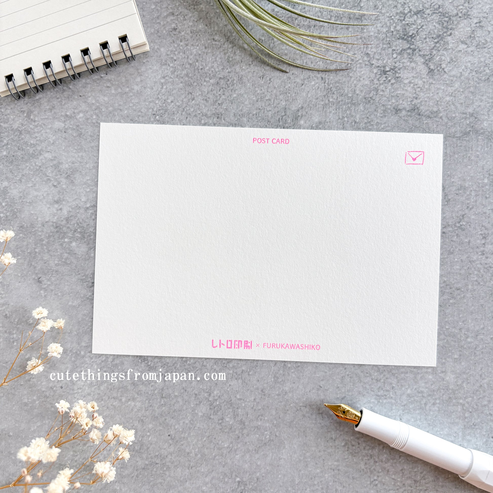 Cute postcard by a unique printing technique called risograph. Unlike regular printing, it is done one color at a time, resulting in unexpected and charming misprints, also known as "aji" or "fun taste" in Japanese. Enjoy this fun and distinctive feature in this retro-style postcard.