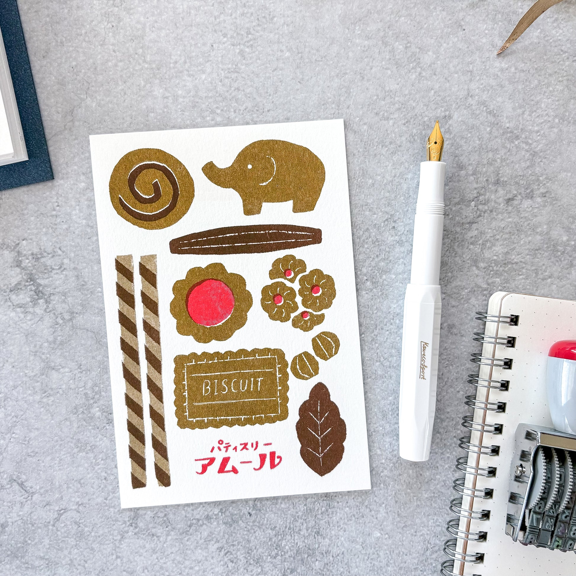 Cute cookies design postcard by a unique printing technique called risograph. Unlike regular printing, it is done one color at a time, resulting in unexpected and charming misprints, known as "fun taste" in Japanese. Enjoy this fun and distinctive feature in this retro-style postcard.