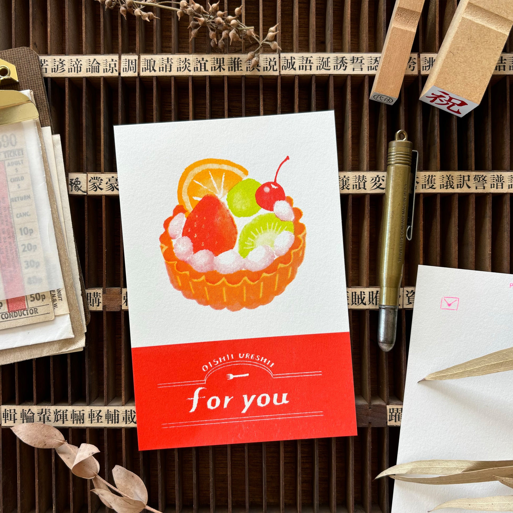 Cute fruit tart design for you postcard by a unique printing technique called risograph. Unlike regular printing, it is done one color at a time, resulting in unexpected and charming misprints, known as "fun taste" in Japanese. Enjoy this fun and distinctive feature in this retro-style postcard.