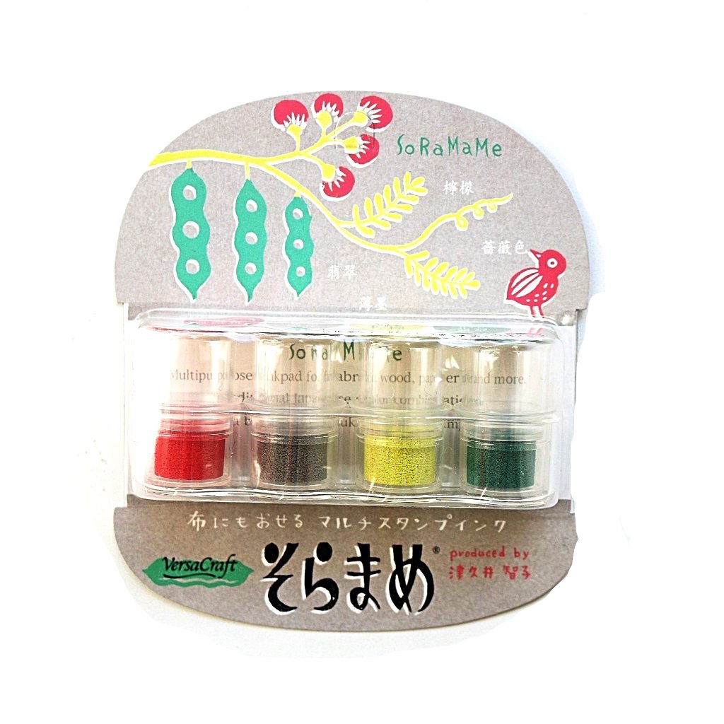 This is a Soramame stamp ink set supervised by Japanese famous eraser-stamp artist Tomoko Tsukui. The stamps come in a storage case in soramame or broad bean shape that can be connected to other soramame cases using the enclosed sticker sheet (see 4th picture) to organize your soramame stamps collection.