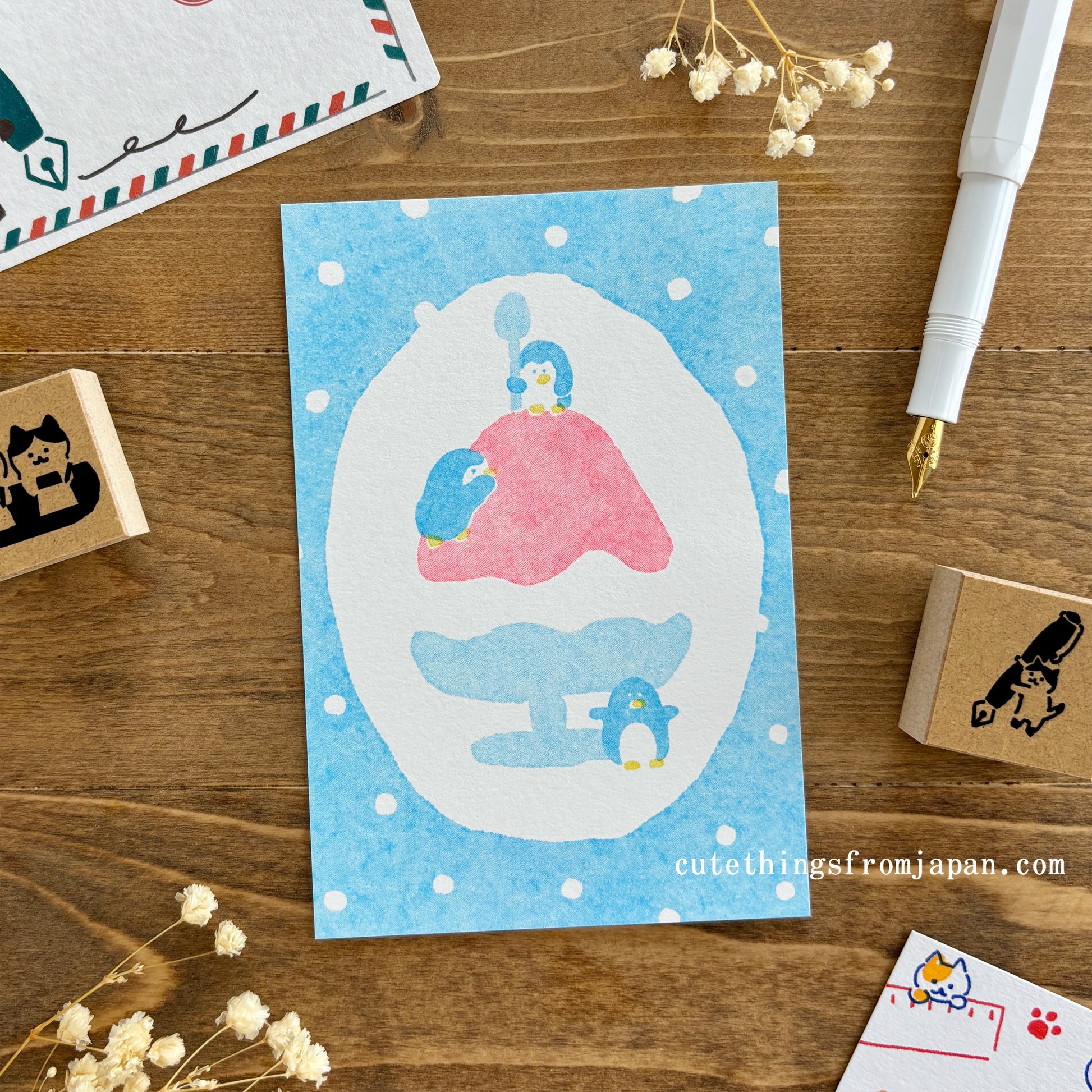 Cute postcard by a unique printing technique called risograph. Unlike regular printing, it is done one color at a time, resulting in unexpected and charming misprints, also known as "aji" or "fun taste" in Japanese. Enjoy this fun and distinctive feature in this retro-style postcard.
