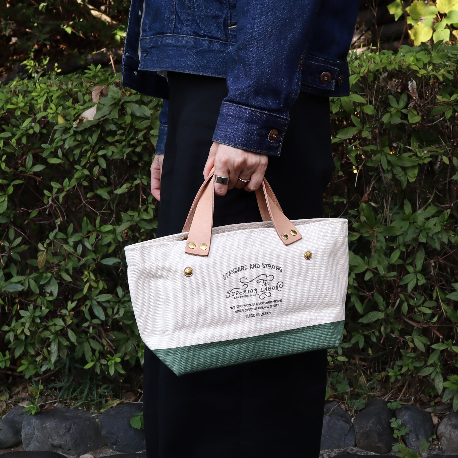 使用しているキャンバスは、旧式のシャトル織機で1日にわずか2反しか織ることができない「倉敷帆布」。真鍮パーツは東京の職人による手作業で製造され、レザーにはミモザの樹皮から抽出されたタンニンで鞣された革を使用しています。縫製・塗装・洗い・組み立てまで、すべての工程が職人の手によって丁寧に行われた、素材と手仕事の温もりが詰まった一品です。