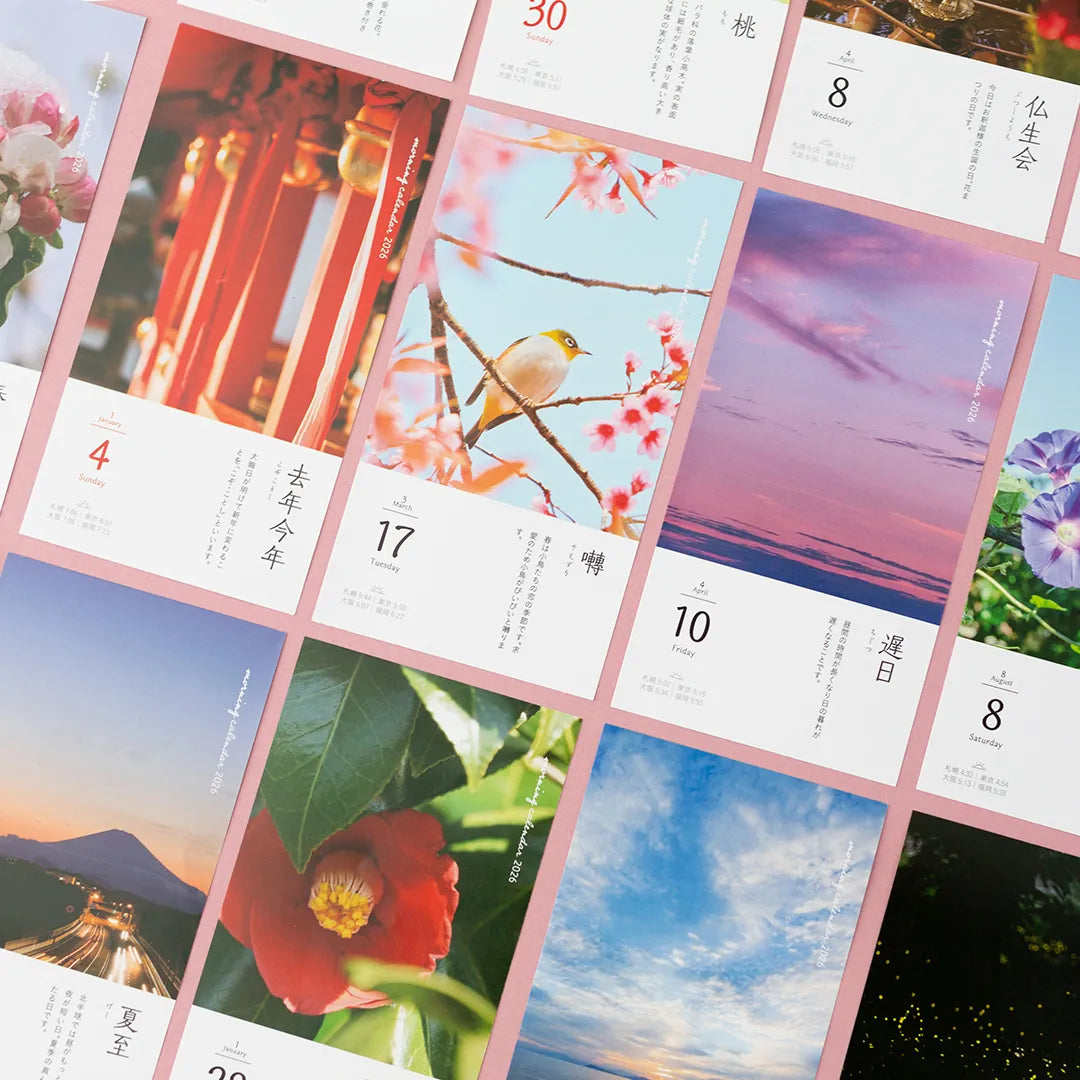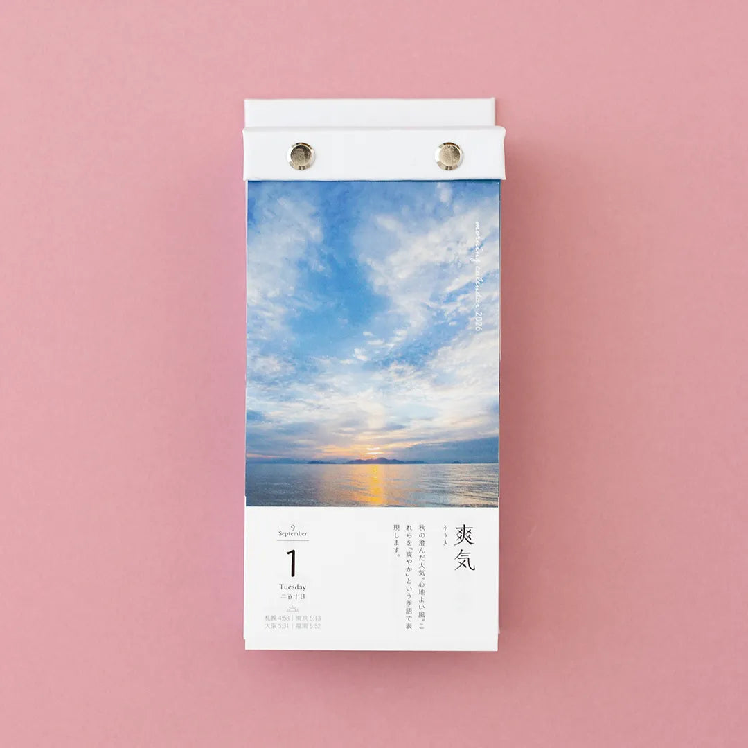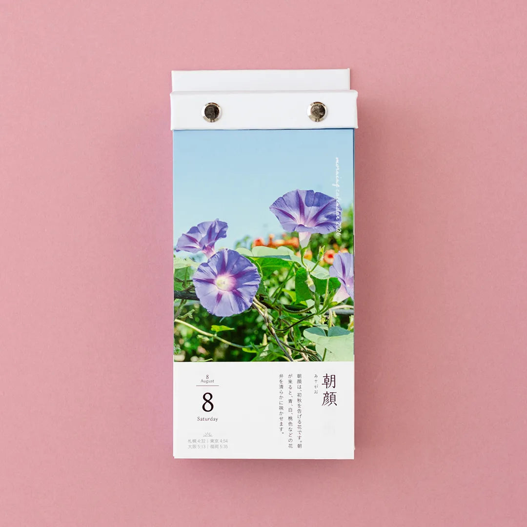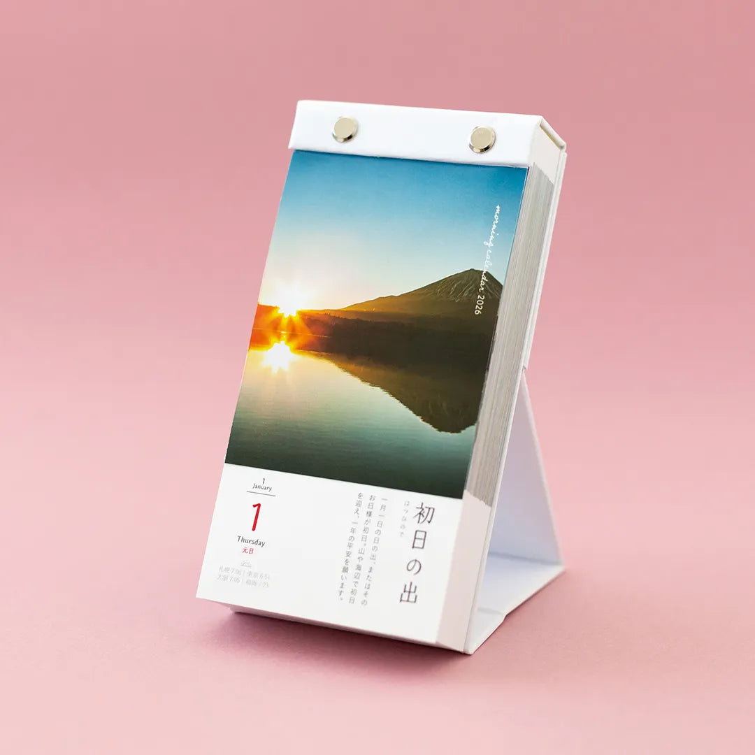 This desktop flip calendar brings a small moment of enjoyment to each day. Along with the date, every page includes photo of Japanese seasons, plus the sunrise time. Its compact size and foldable cover make it easy to keep on your desk as both a calendar and a piece of décor.