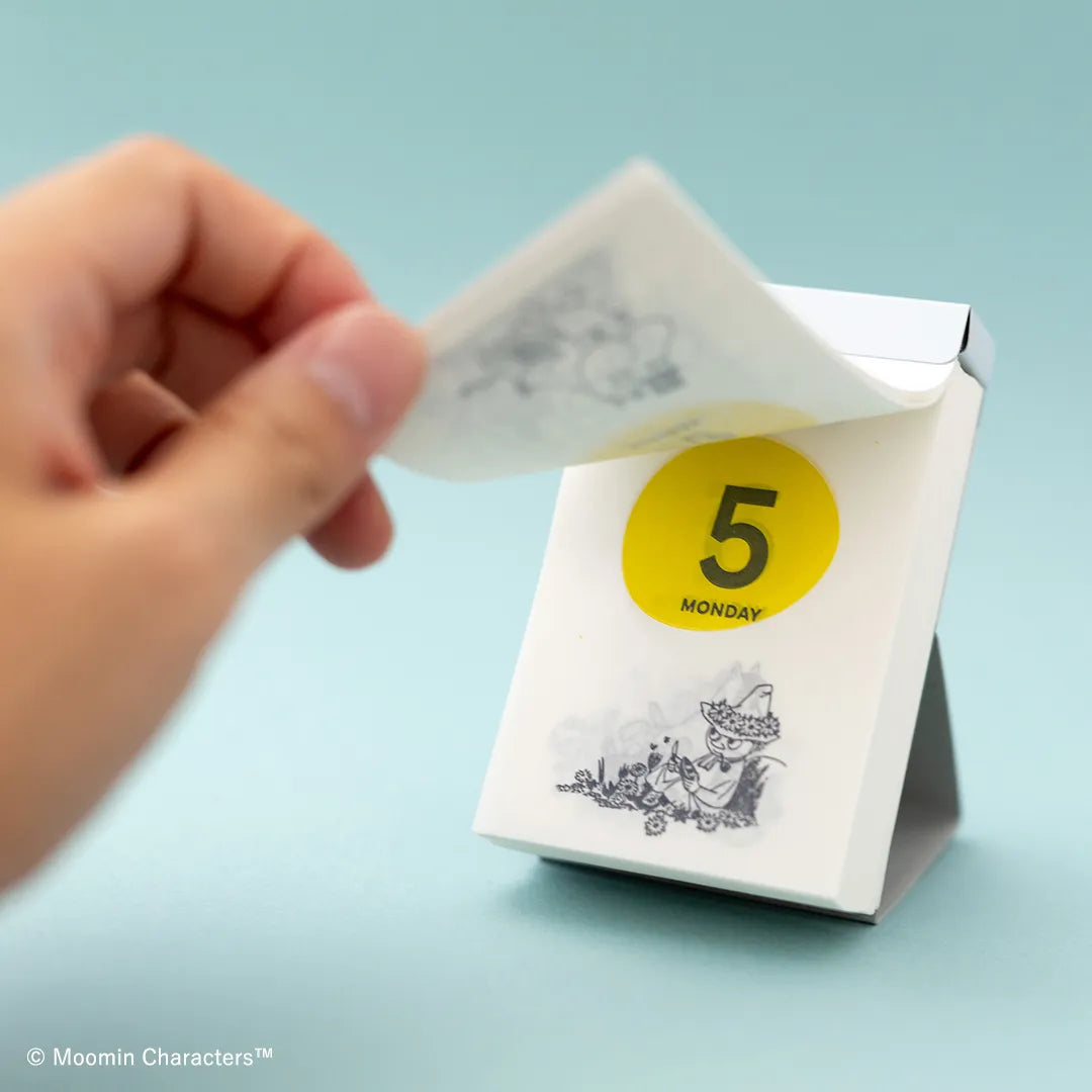 Enjoy Moomin and moon phases every day in a compact format. This mini daily flip calendar features charming illustrations of Moomin characters alongside the moon’s changing phases. Designed in soft tones of gray and yellow, it works beautifully on your desk or hung on a wall.