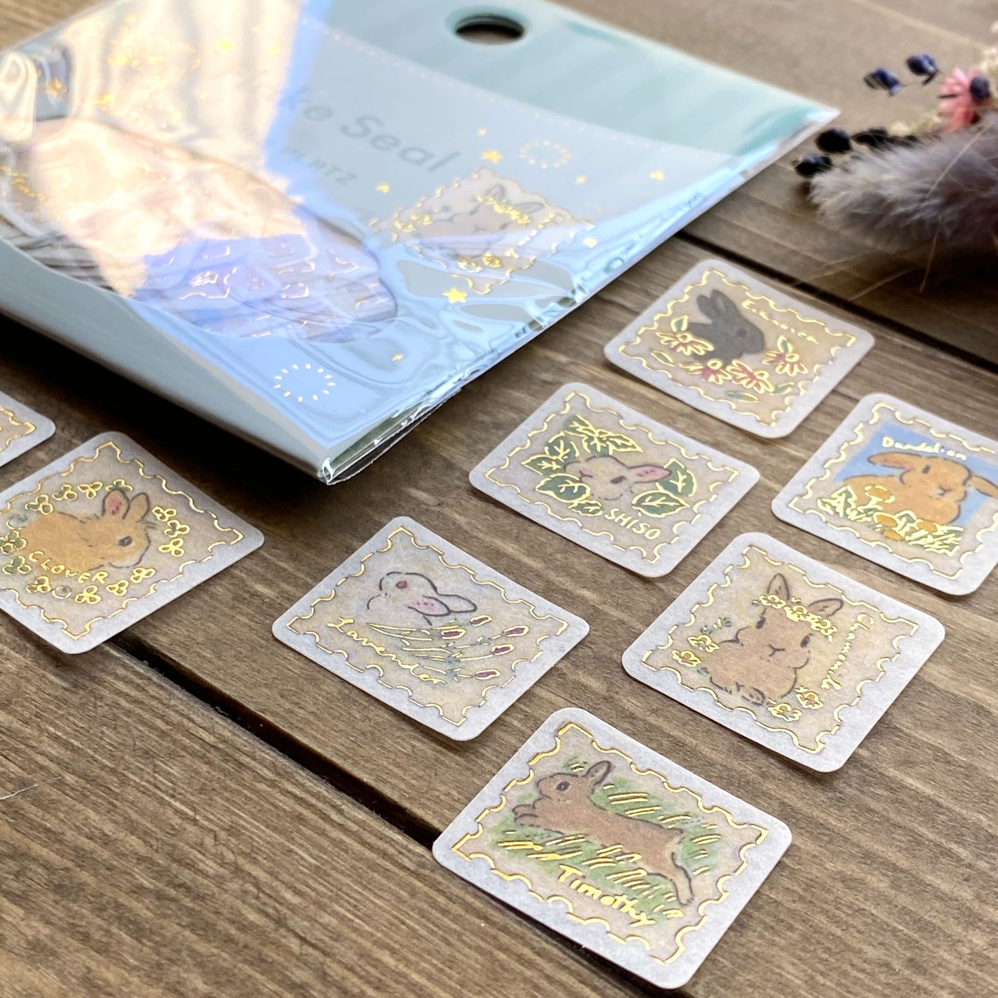 Adorable bunny motif flake stickers by Japanese illustrator Shinako Moriyama great for your craft project and embellishment. Part of the design on each sticker is hot-stamped in gold which shine in reflection of light. You can find her adorable art work on her Instagram HERE.