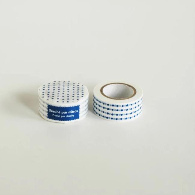 This is a simple blue dot washi tape by collaboration of Classiky with Japanese cloth artist Mariko Okumura known as mitsou. Great for your craft project and gift wrapping.