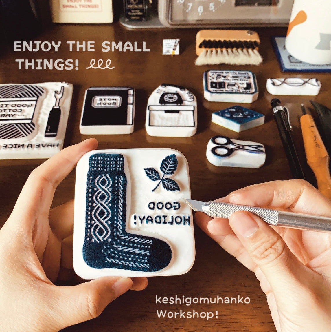 さらに、eric さんがこれまで手彫りしてきた貴重な消しゴムはんこコレクションを、その場でノートに押せる時間もあります。ワークショップ参加者限定の特別な機会です。初めての方でも大丈夫。ゆっくり、楽しく、自分だけの消しゴムはんこを彫っていきましょう。