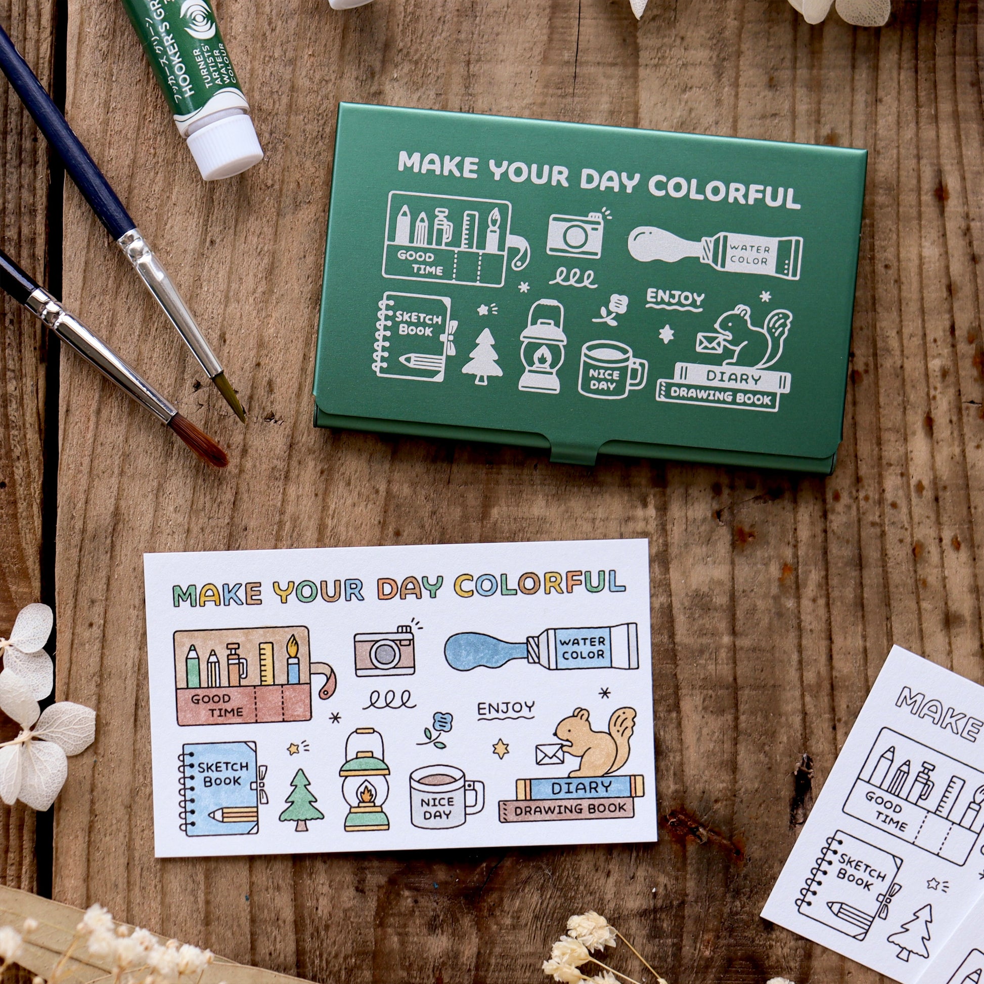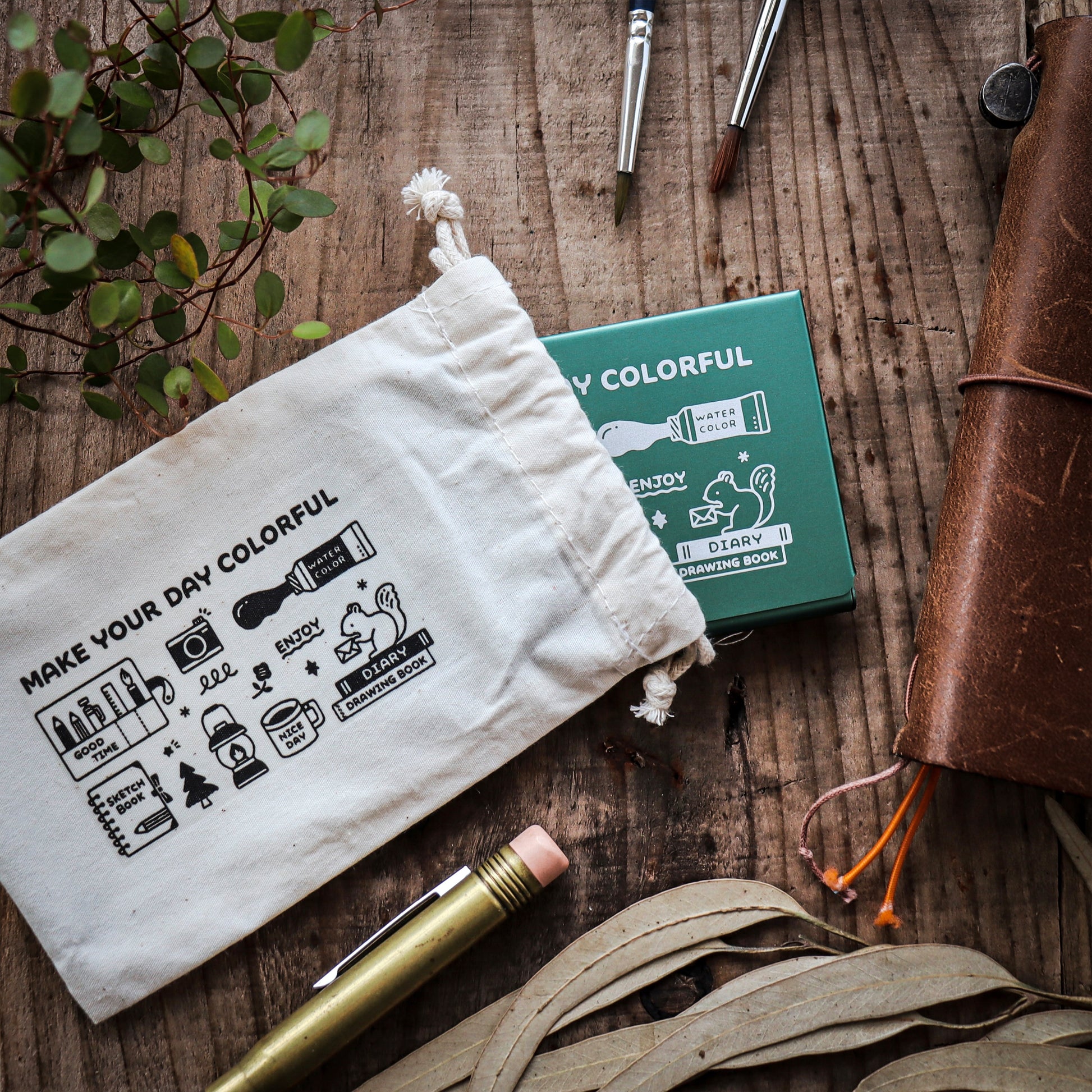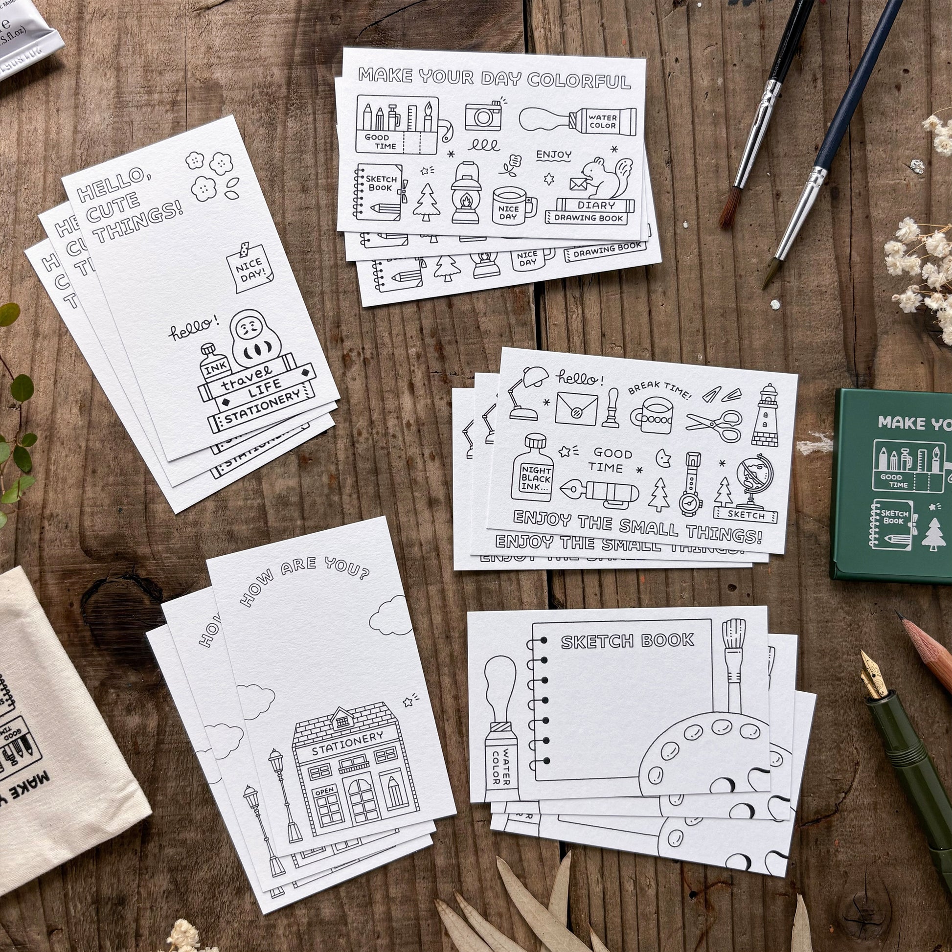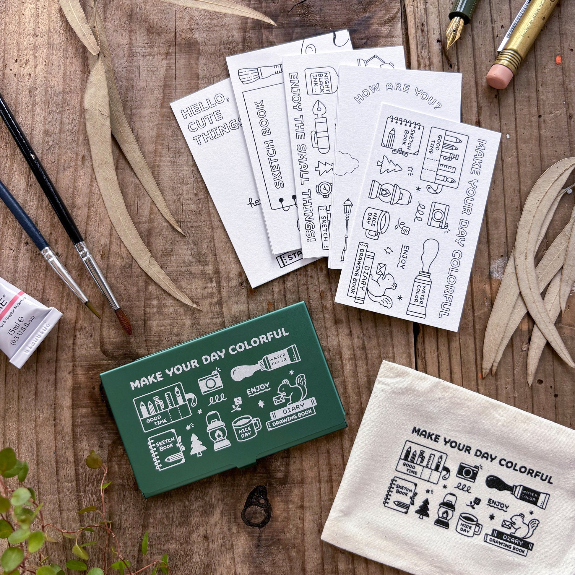 It also includes business card-sized coloring cards featuring eric's illustrations (5 designs, 3 sheets per design), perfect for coloring or using as message cards. A cotton storage bag is also included.