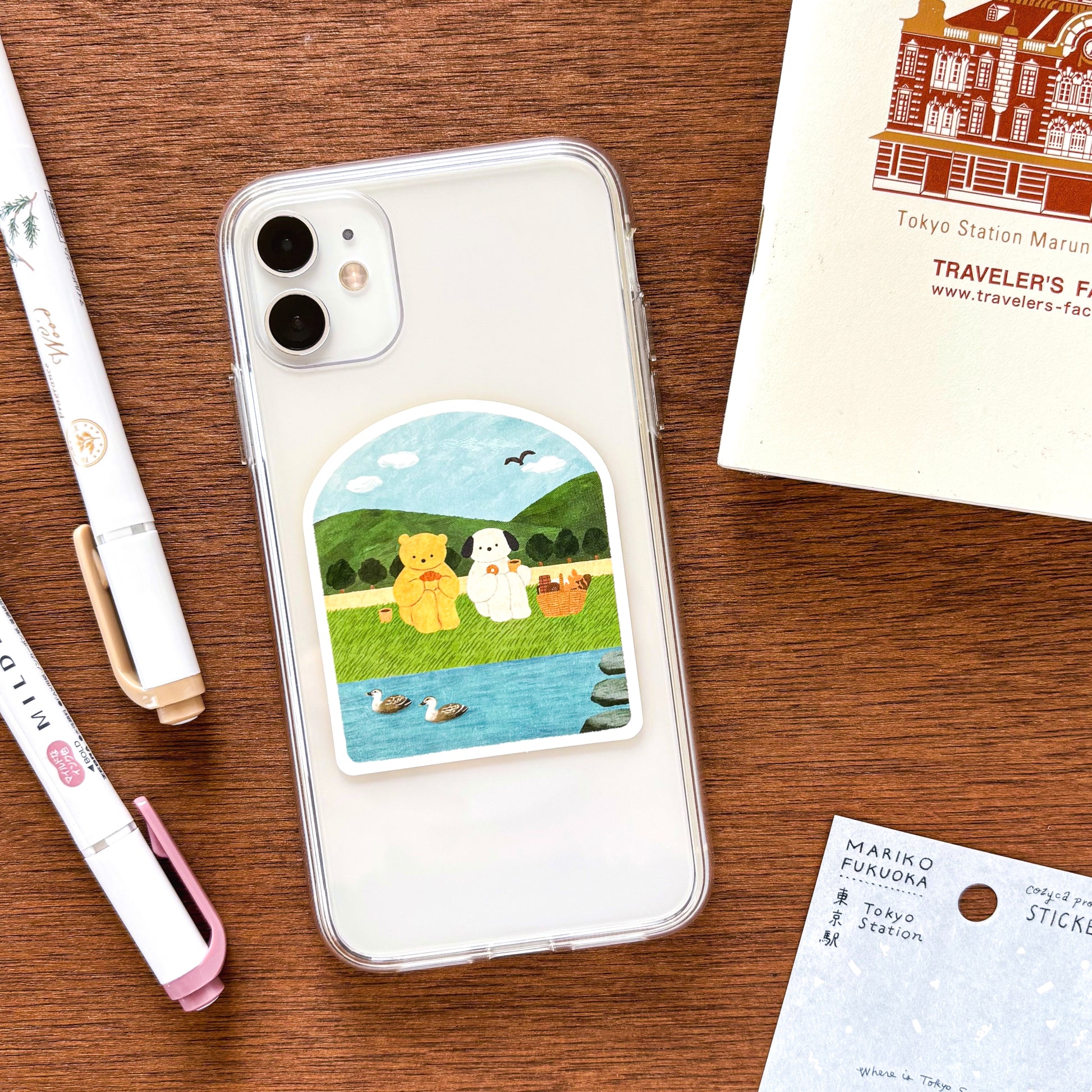 A vinyl sticker of cute friends enjoying picnic design illustrated by Japanese artist Mariko Fukuoka known for her cute cozy illustrations.