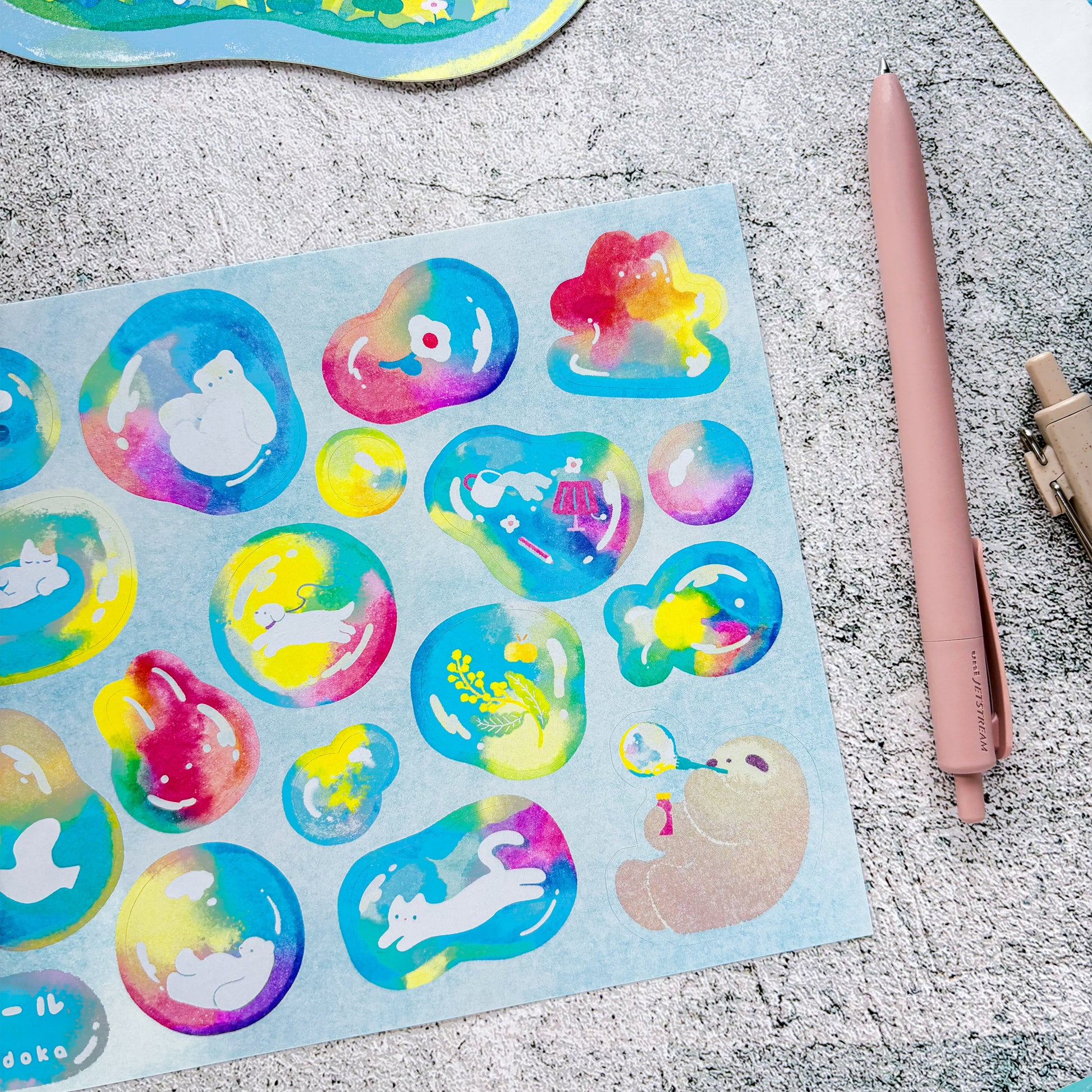 A fun and colorful A5-sized sticker sheet by Japanese artist Nodoka Miyashita, featuring dreamy bubble illustrations, perfect for decorating your planner or journal. Nodoka studied oil painting at university, and her artwork is often seen in magazines and on stationery. She loves drawing colorful plants and landscapes to capture the beauty and joy of nature.
