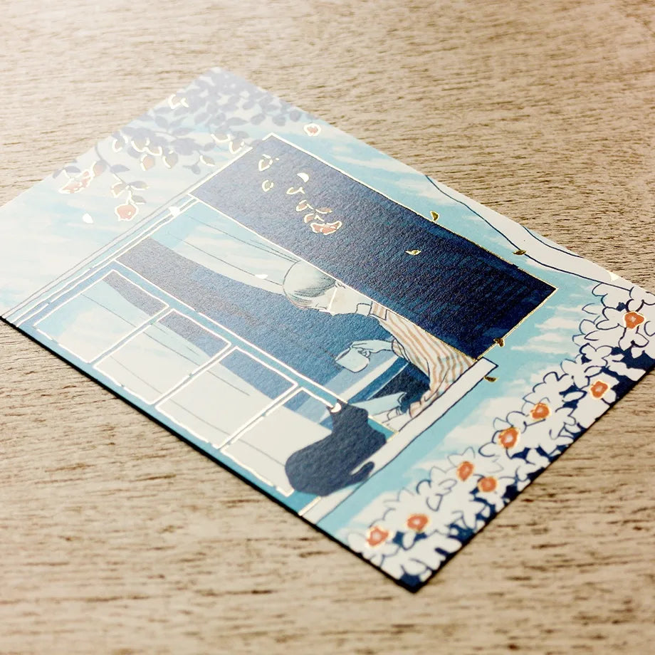 Beautiful postcard designed by a Japanese artist Sayuri Fujimaki. The card is hot-stamped which beautifully shine in reflection of light. The design is on the both sides (4th picture for the back design).