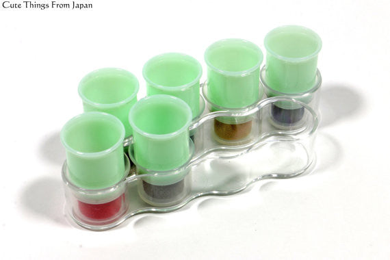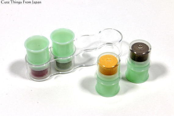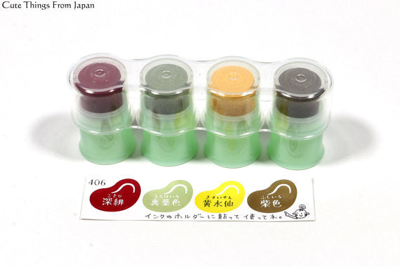 Each set comes with soramame shape color sample stickers to stick to the side of the stamp (green part) (see 2nd picture). As 5th picture shows, you can set the ink to your finger when used. The ink colors are Japanese traditional colors often used for kimonos, Japanese traditional clothes.