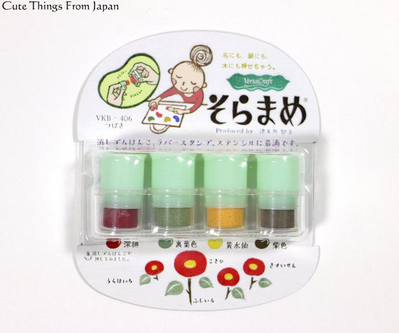 This is a Soramame stamp ink set supervised by Japanese famous eraser-stamp artist Tomoko Tsukui. The stamps come in a storage case in soramame or broad bean shape that can be connected to other soramame cases using the enclosed sticker sheet (see 4th picture) to organize your soramame stamps collection.