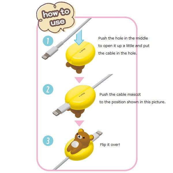 This is an adorable Sumikko Gurashi charging cable clip to prevent the cable being damaged. Please see the 3rd picture for how to use (in different design). This product can be used for iPhone charging cable or a cable whose width is within 2.9mm to 3.6mm. Please do not use this for a cable wider than that.