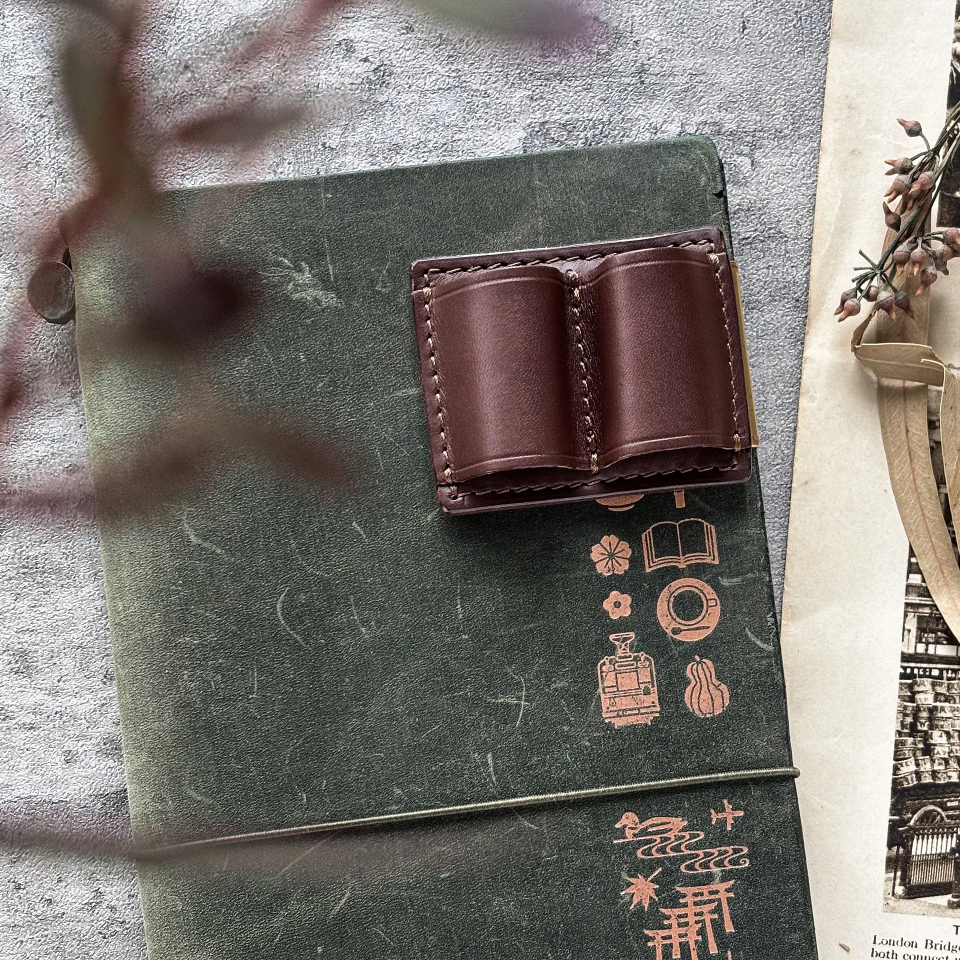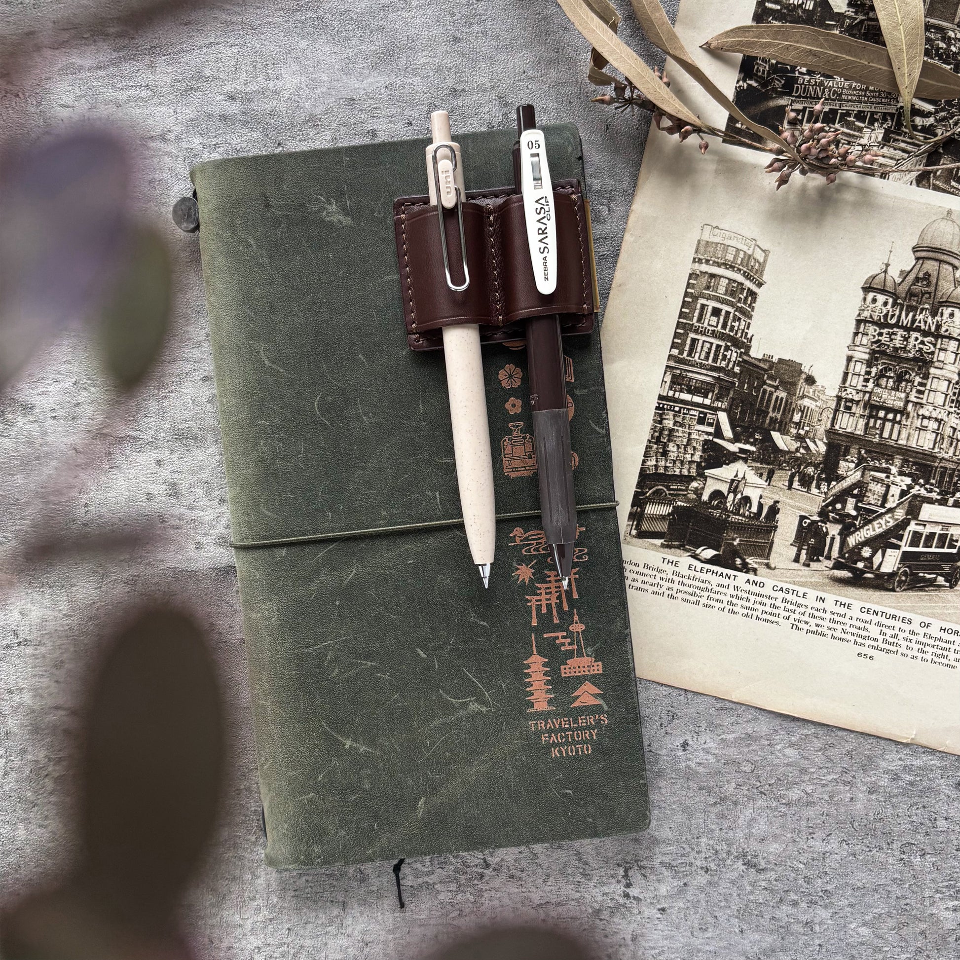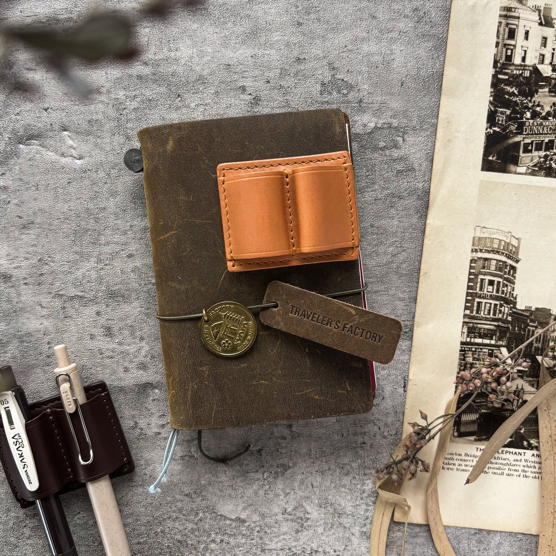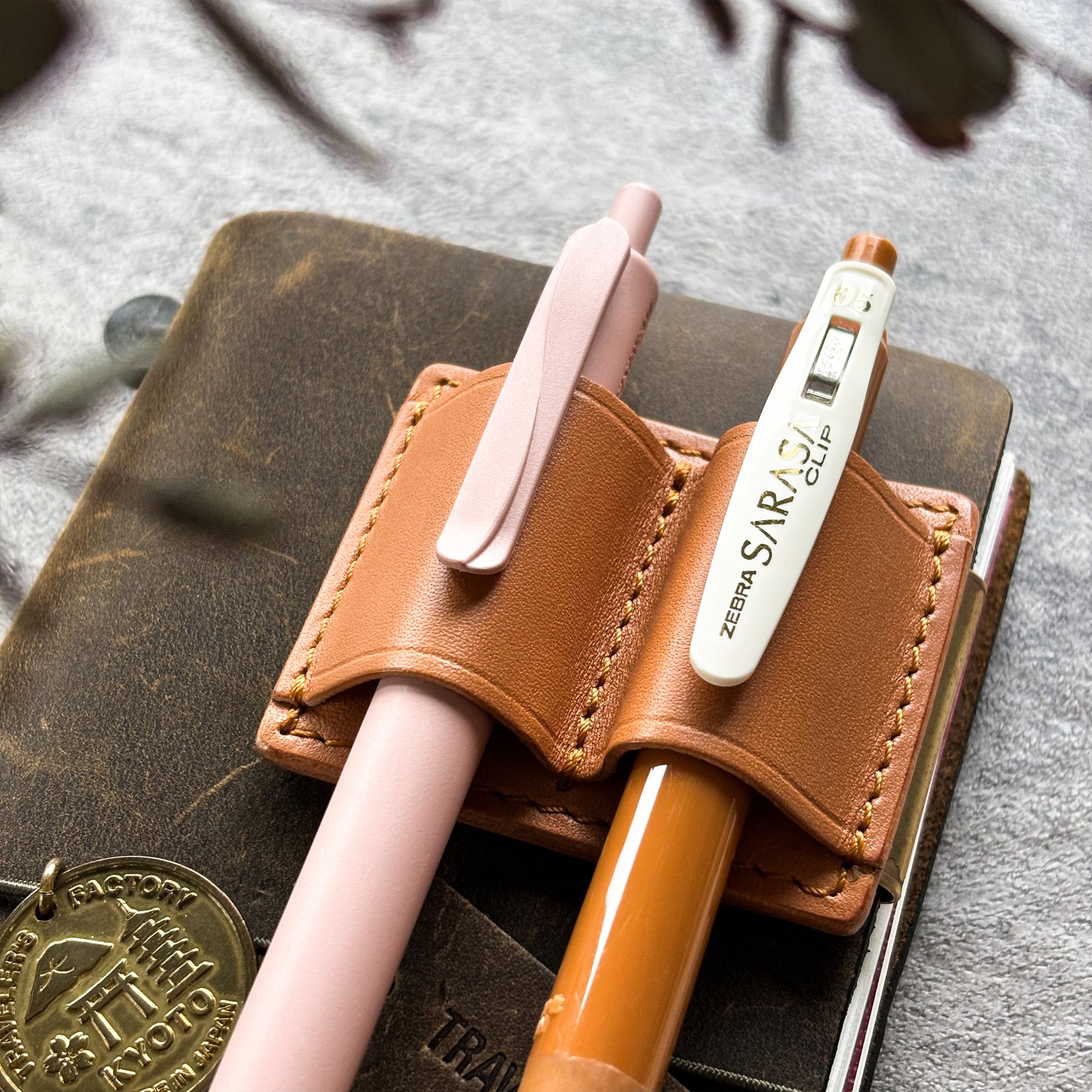 This is a beautiful INGRASSATO leather and brass pen holder (holds two pens), handcrafted by The Superior Labor - a Japanese brand from Okayama known for high-quality leather and canvas goods. It can be attached to your notebook cover. Available in 3 leather colors: tan, brown, and black.