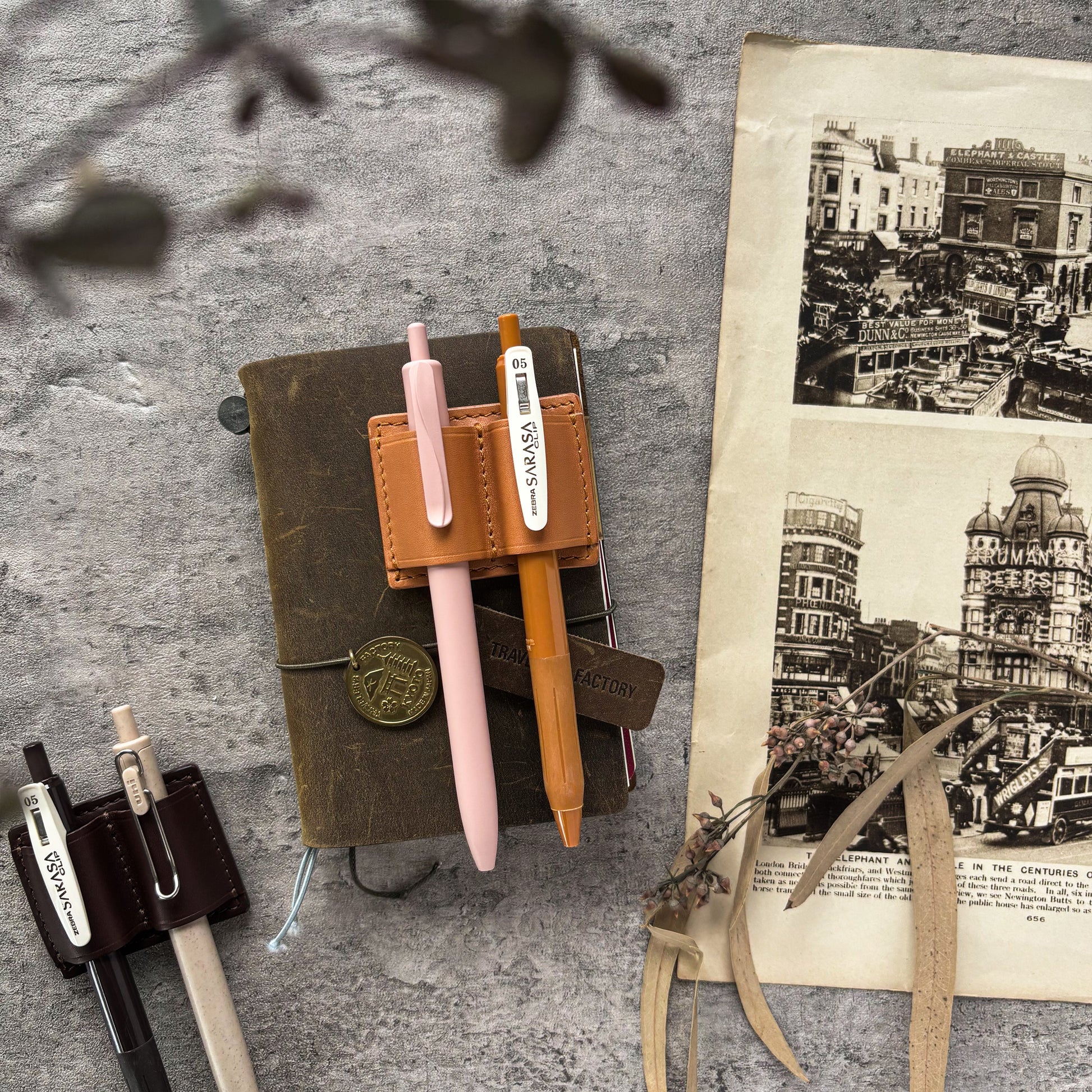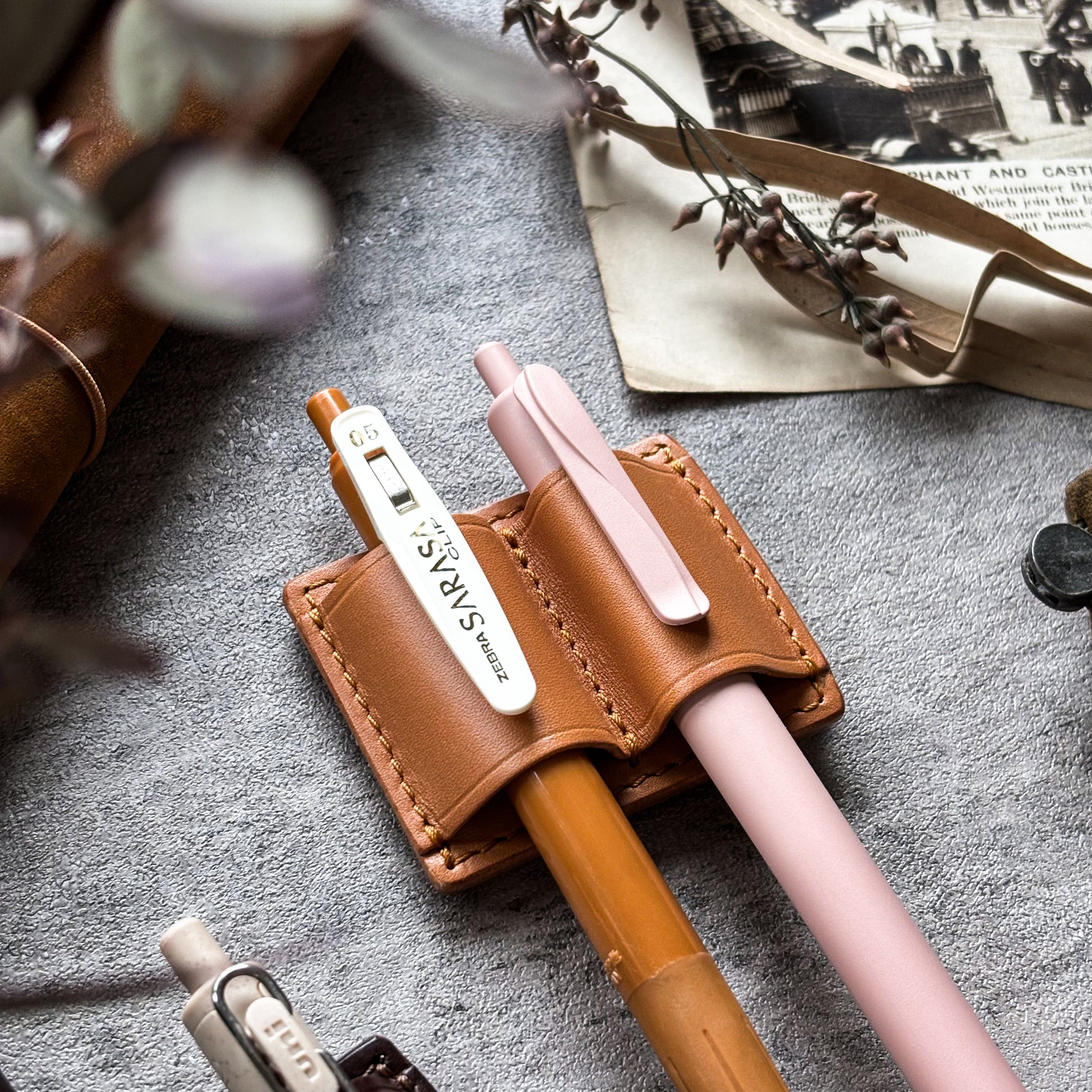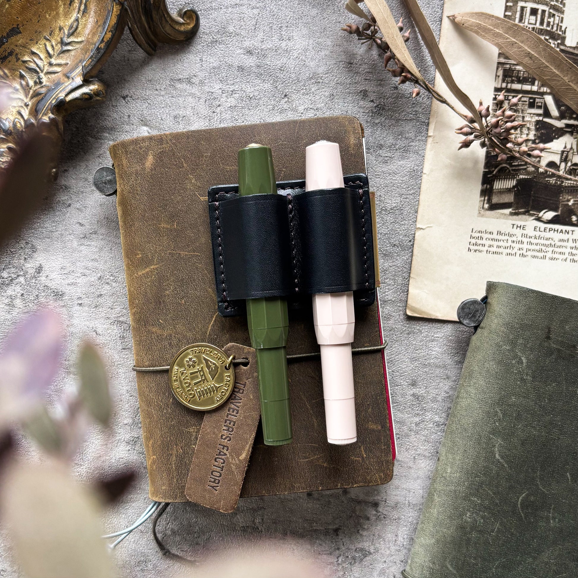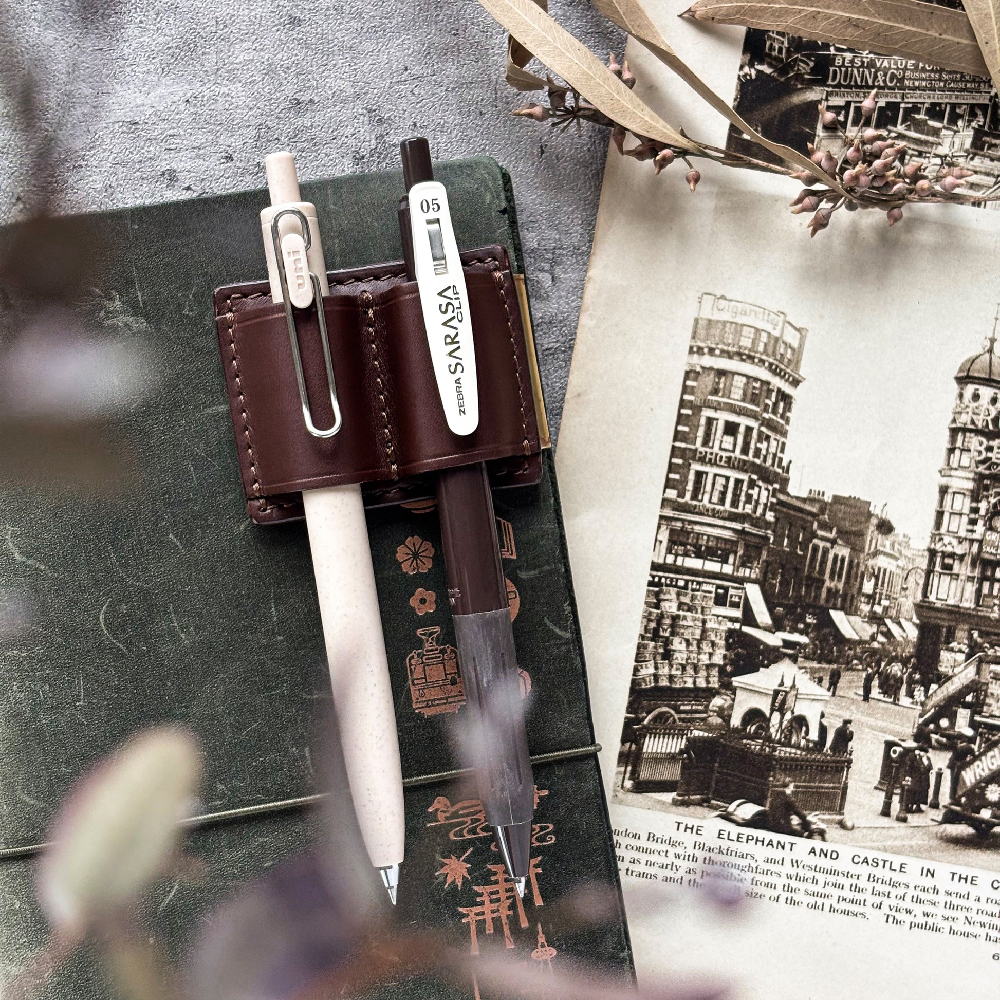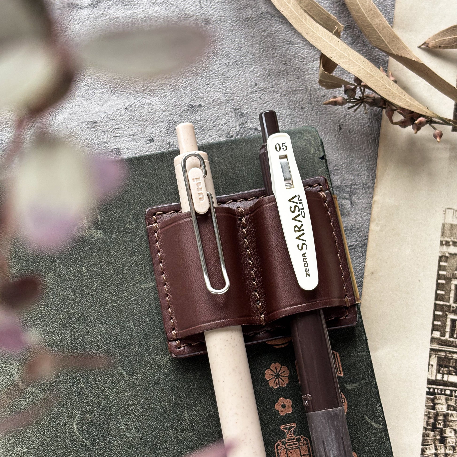 This is a beautiful INGRASSATO leather and brass pen holder (holds two pens), handcrafted by The Superior Labor - a Japanese brand from Okayama known for high-quality leather and canvas goods. It can be attached to your notebook cover. Available in 3 leather colors: tan, brown, and black.