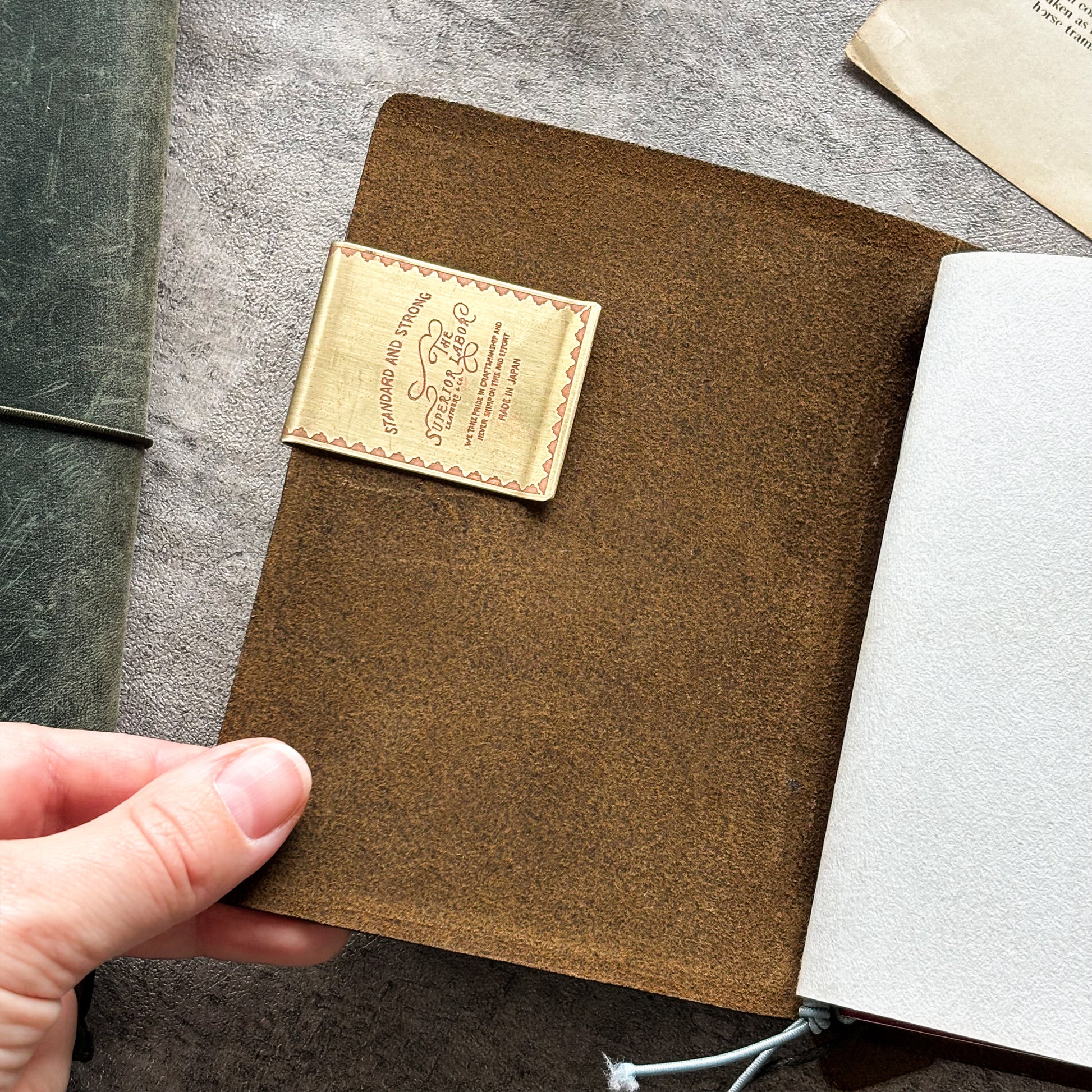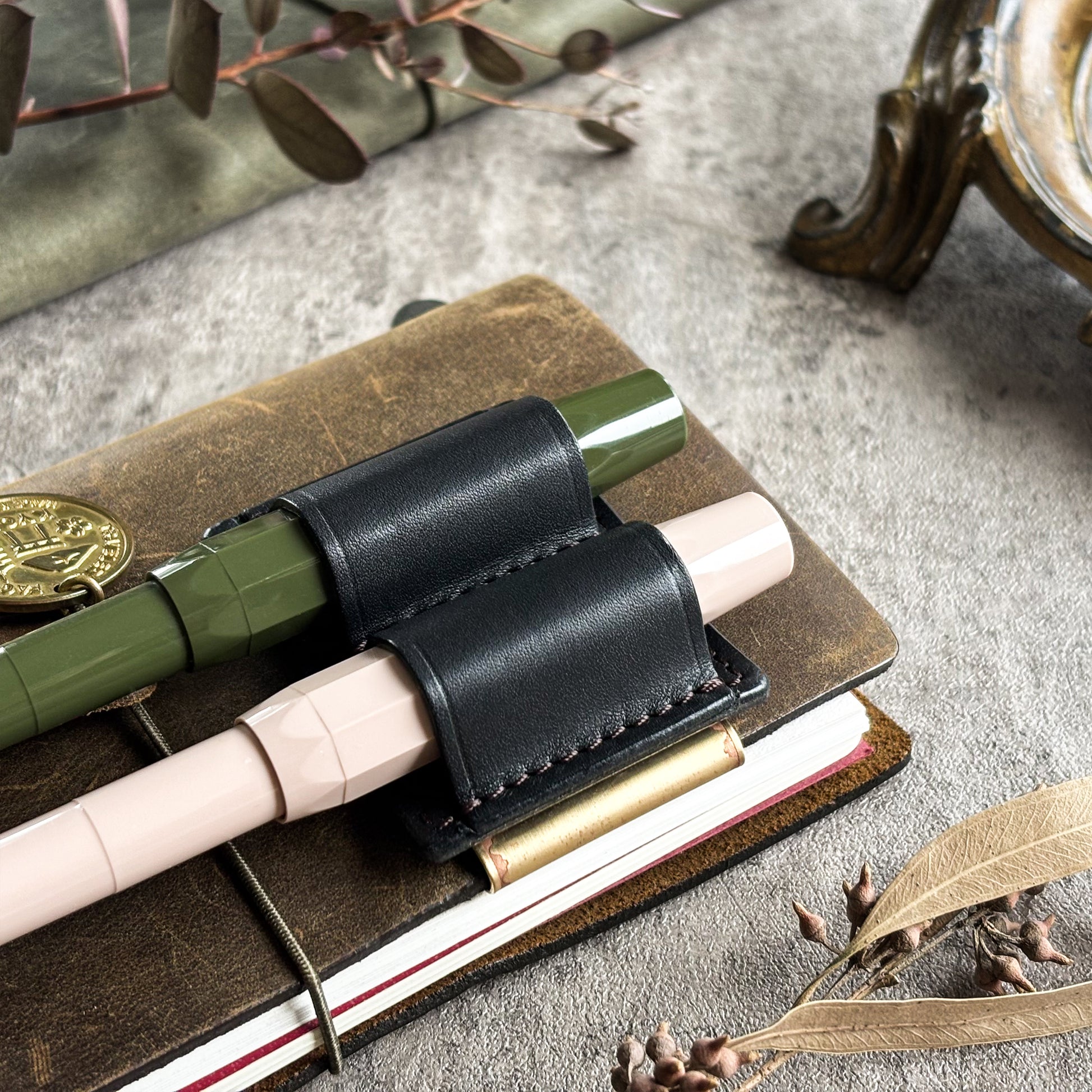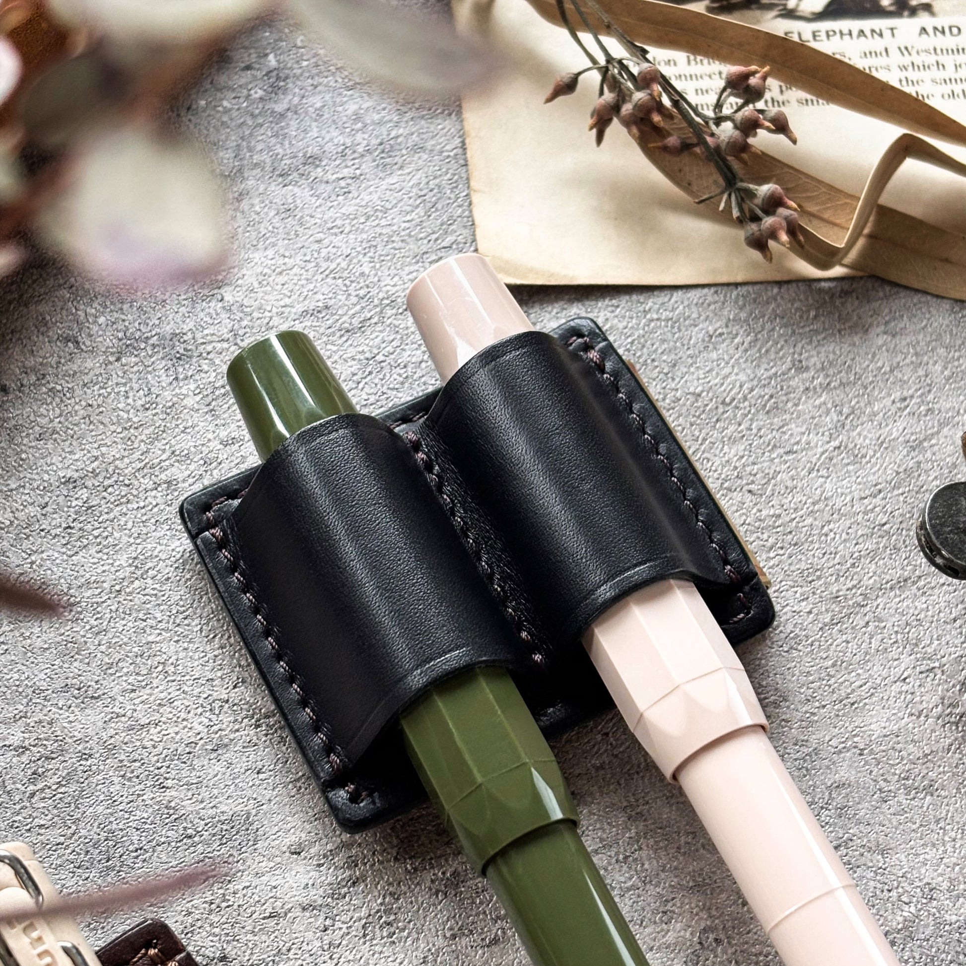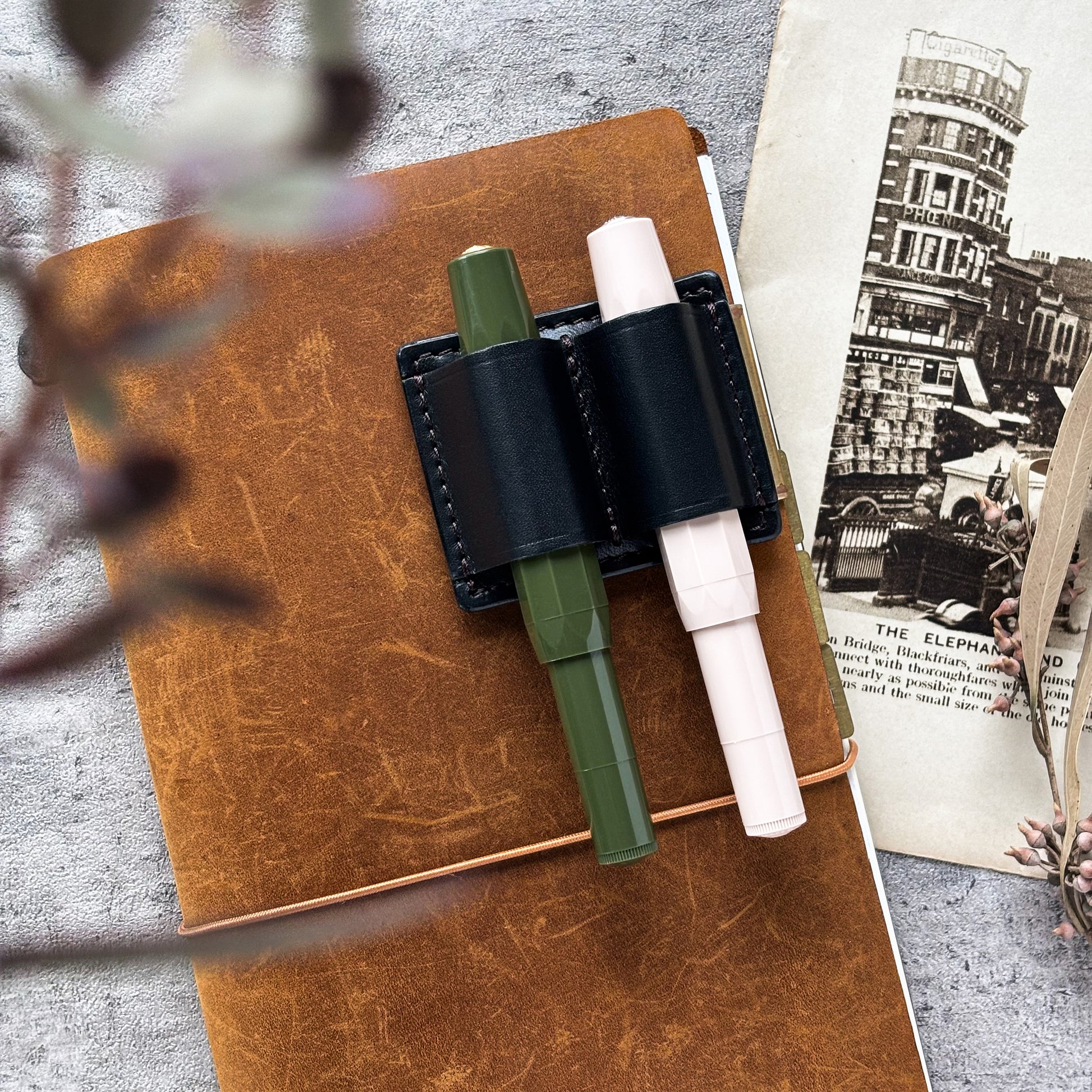 This is a beautiful INGRASSATO leather and brass pen holder (holds two pens), handcrafted by The Superior Labor - a Japanese brand from Okayama known for high-quality leather and canvas goods. It can be attached to your notebook cover. Available in 3 leather colors: tan, brown, and black.