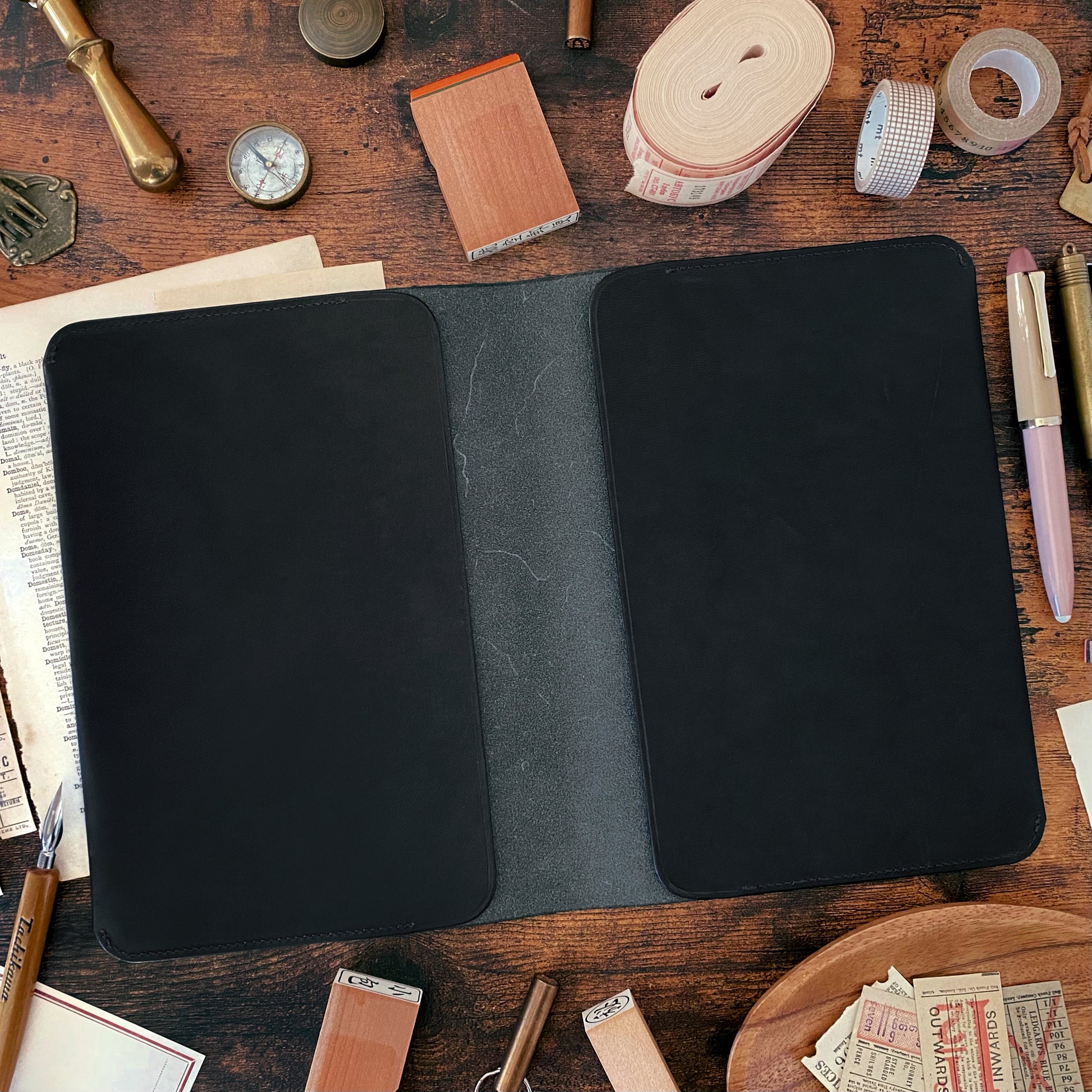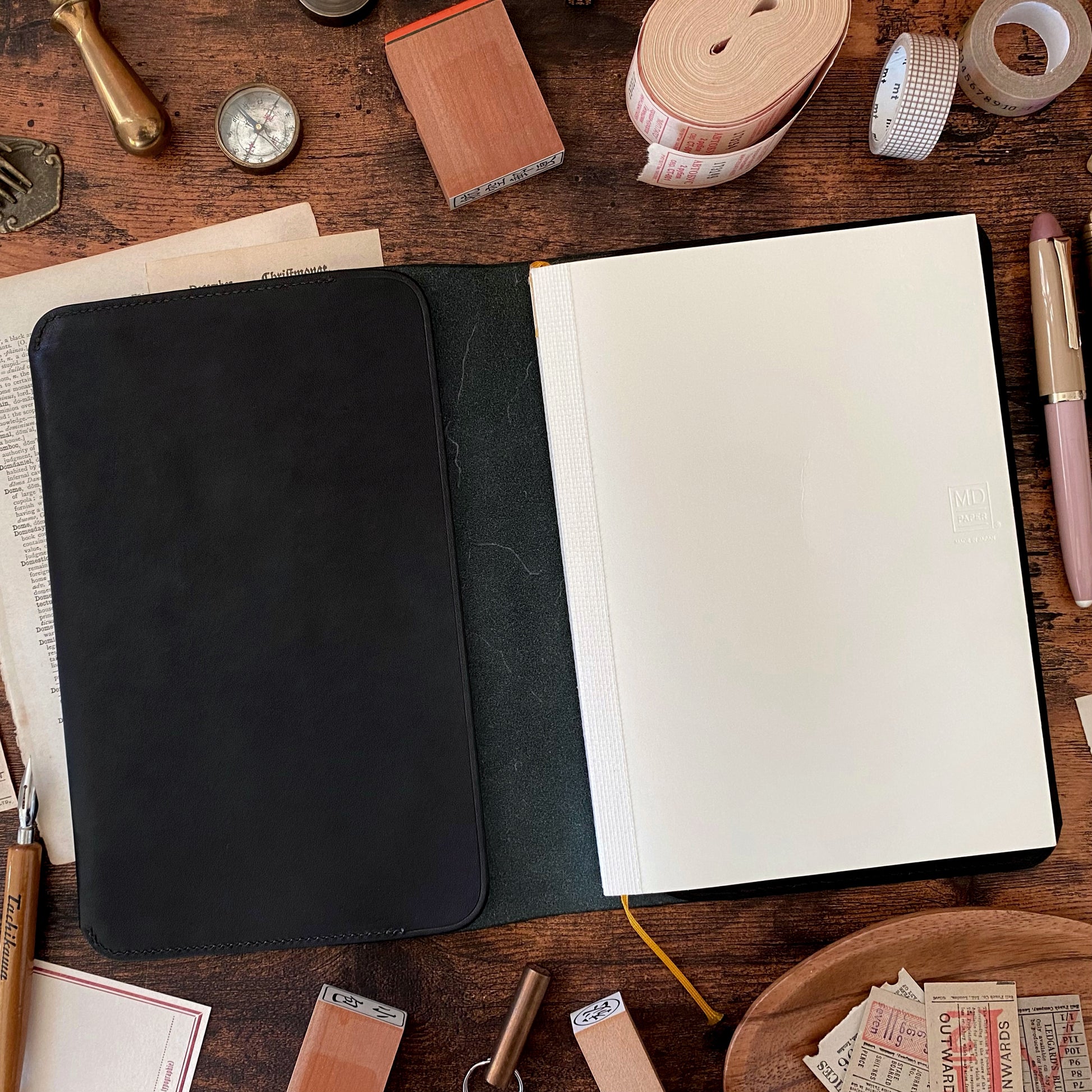 Beautiful leather notebook cover handmade by The Superior Labor, a Japanese company with a team of skilled craftsmen based in Okayama Japan who produce high quality leathers and canvas products. The cover holds an A5 planner such as MD Notebook, Hobonichi Cousin, and LEUCHTTURM1917.