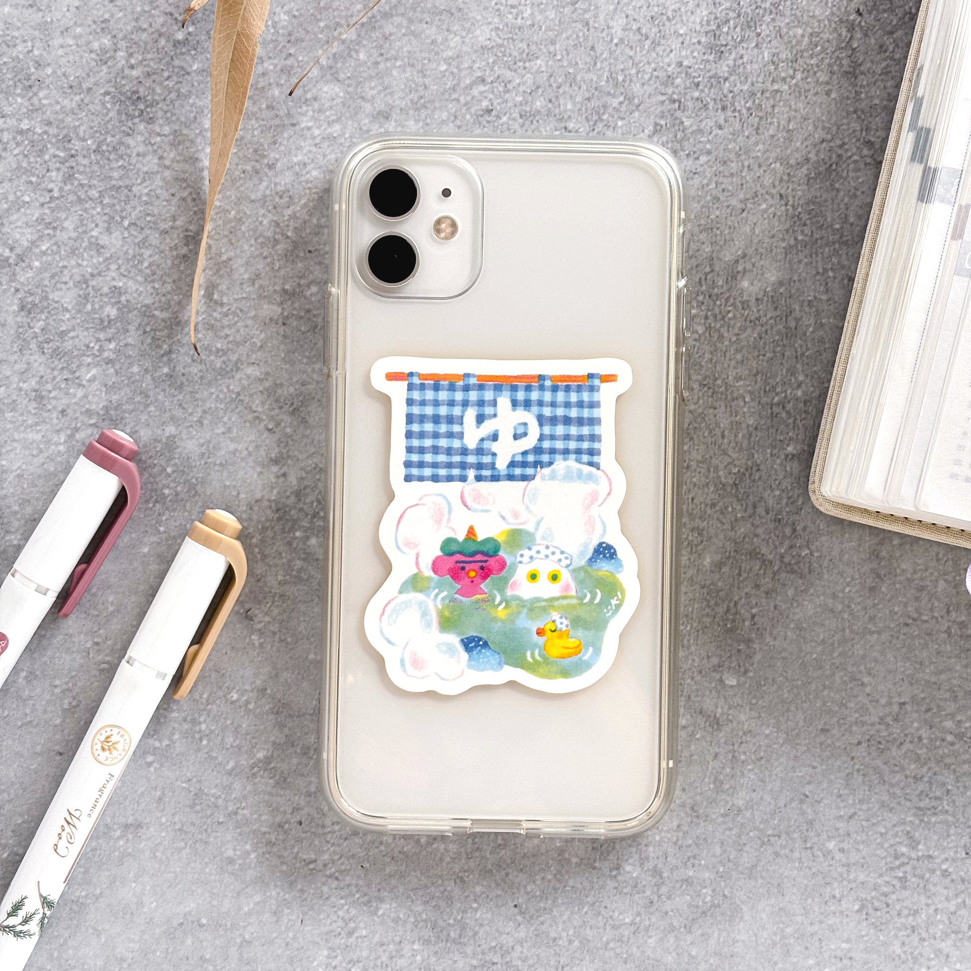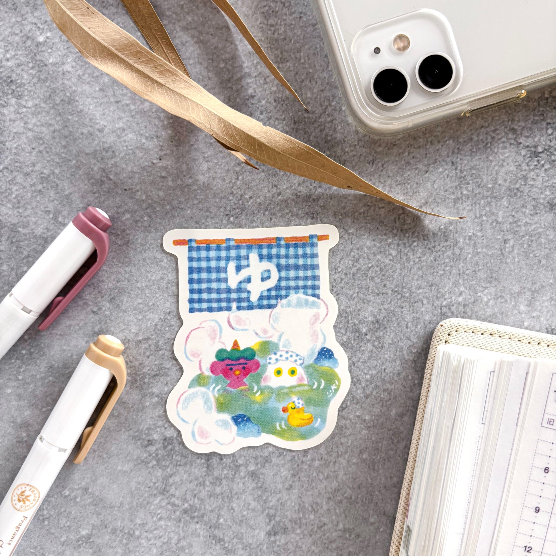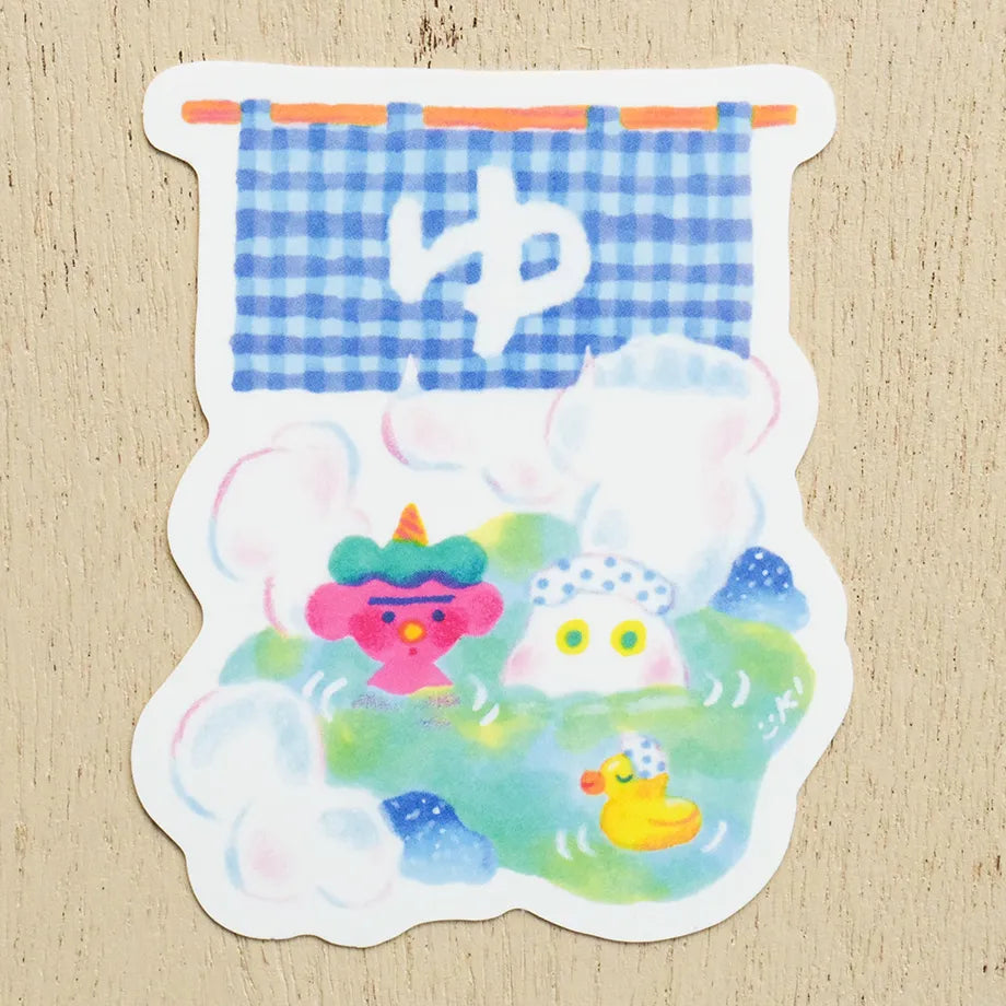 A vinyl sticker of cute hot springs design illustrated by Japanese artist Yuki Itoi known for her colorful and fun illustrations.